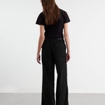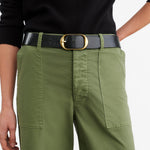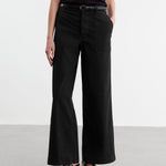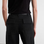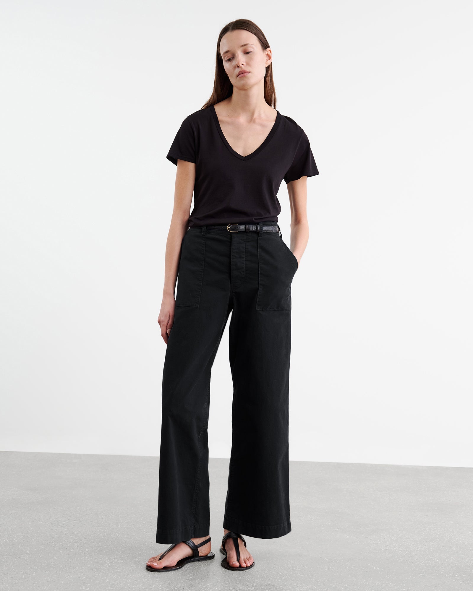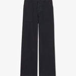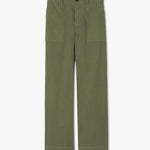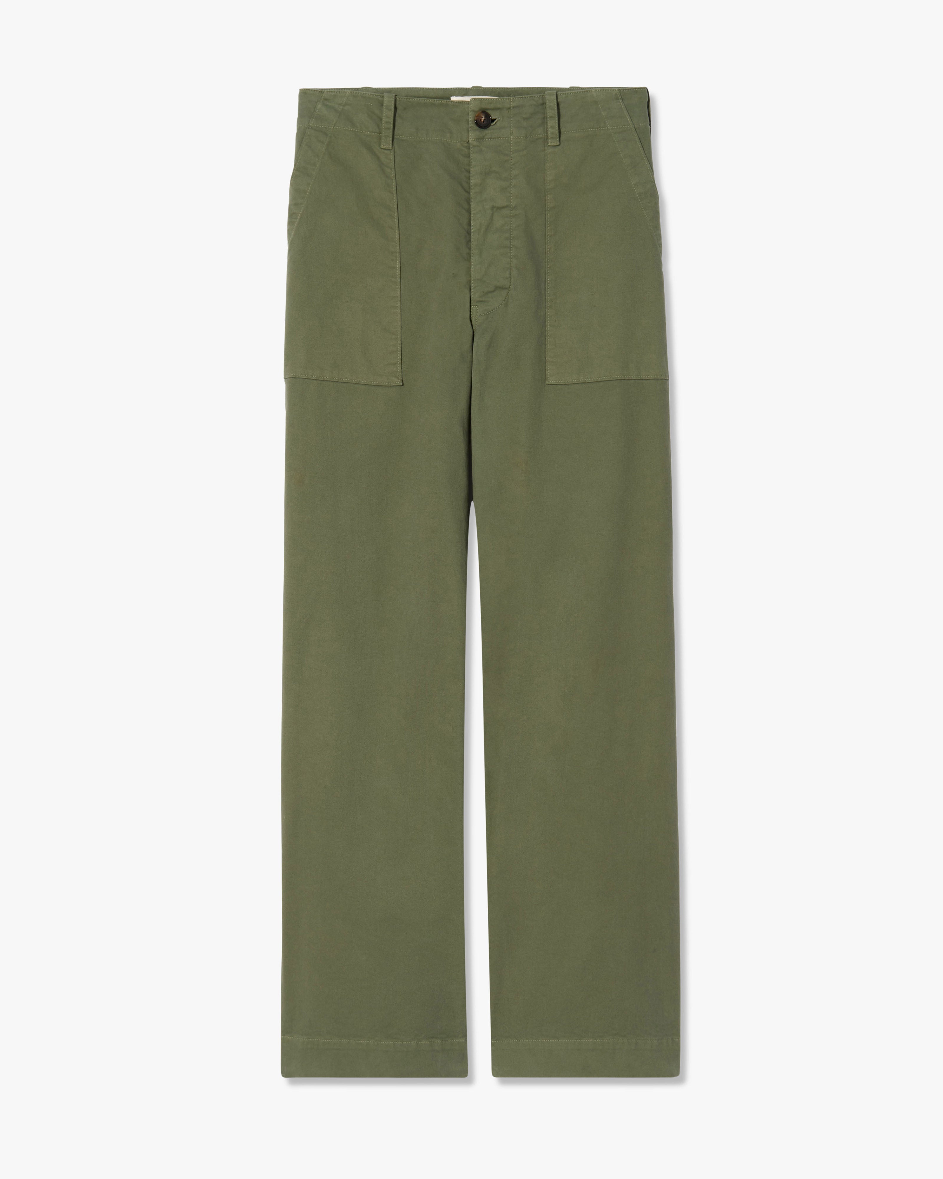 Flat front, mid-rise relaxed straight leg pant in brushed stretch twill cotton. Front patch pockets. Back patch pockets with flaps. Back darts. Zip fly. Button closure. Belt loops.