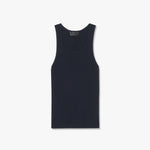 Slim, double ply rib knit tank in cotton. Jersey tubular trim at neck and arm hole. Fashioning along front and back. Normal length.