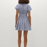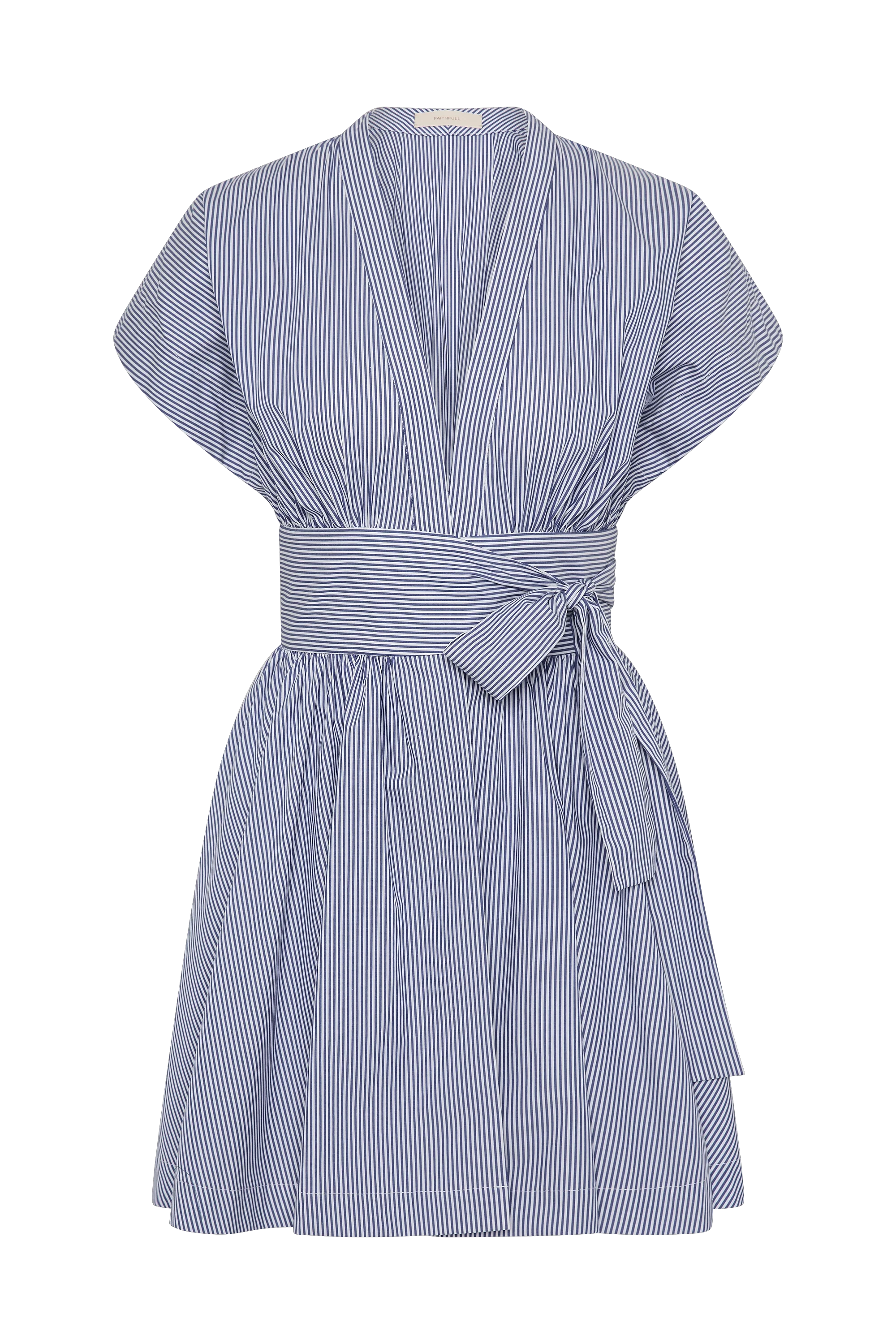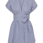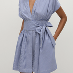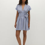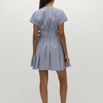 A vacation-inspired mini dress with a deep V-neckline and short cap sleeves. A functional wrap-style silhouette, it features a fixed waistband with an adjustable tie, before relaxing into a gathered A-line skirt, cropping short on the body. Designed from 100% BCI Certified organic cotton in a classic Scandinavian-inspired blue white stripe, style with a simple sandal for late summer dressing.