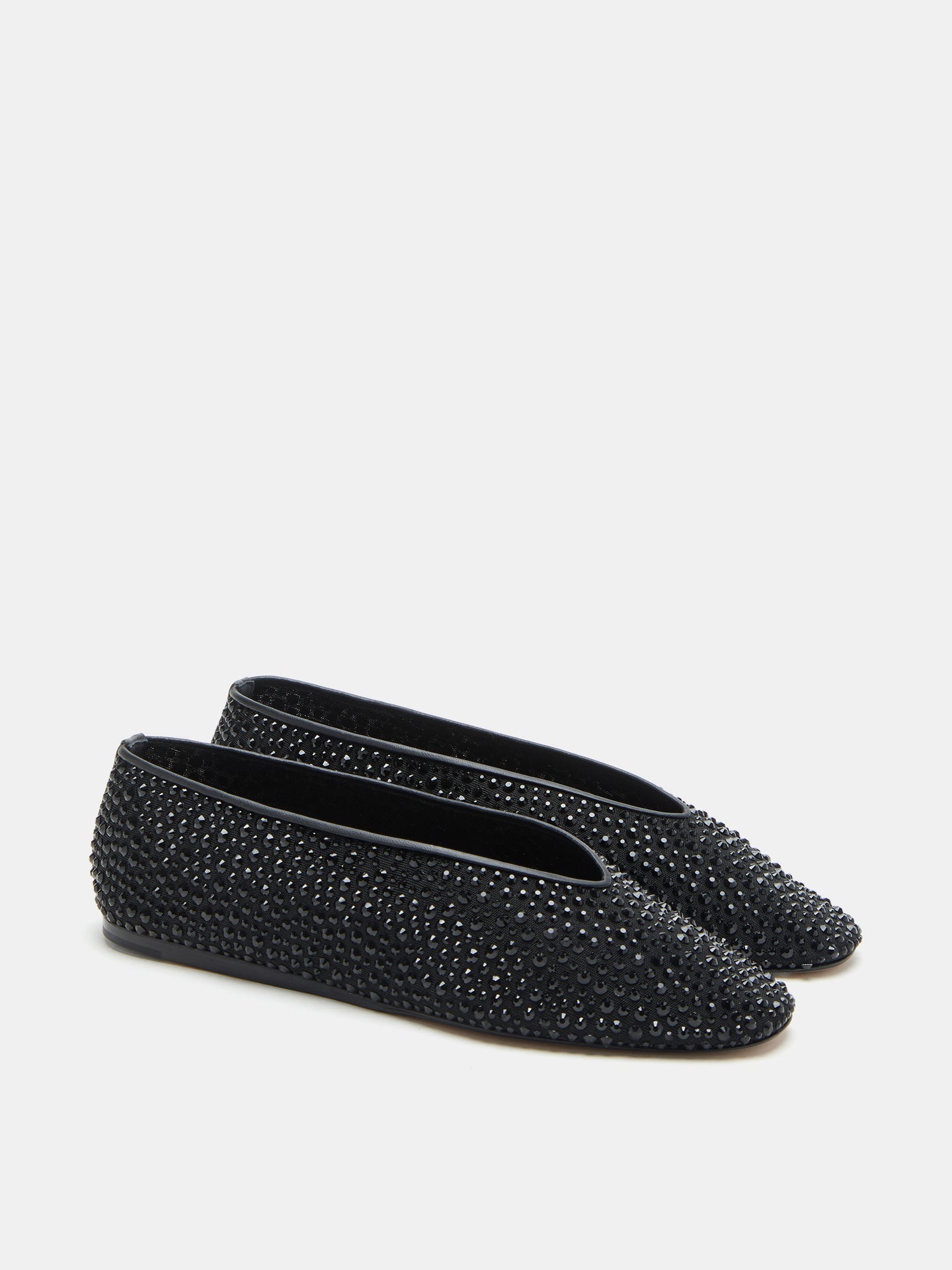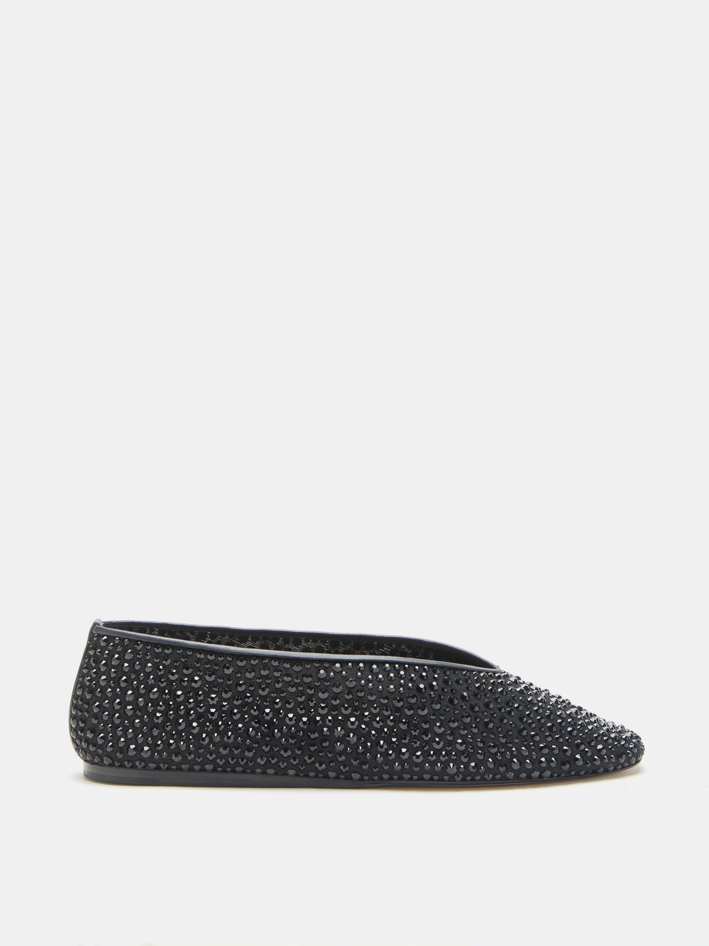 Luna Slipper, handcrafted in black mesh with tonal crystal detailing, a cushioned calf leather insole and leather piping. 8mm heel. Made in Italy.