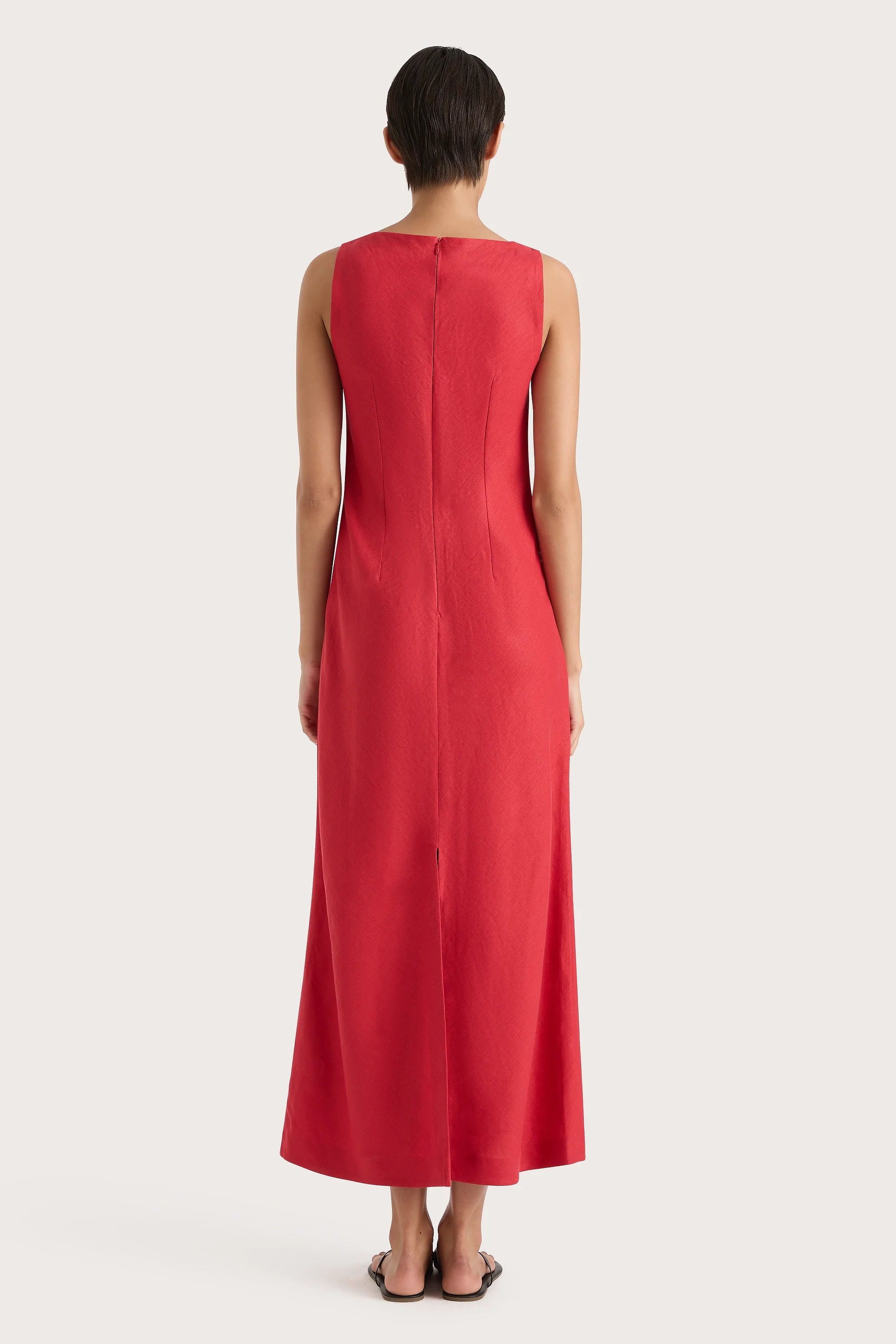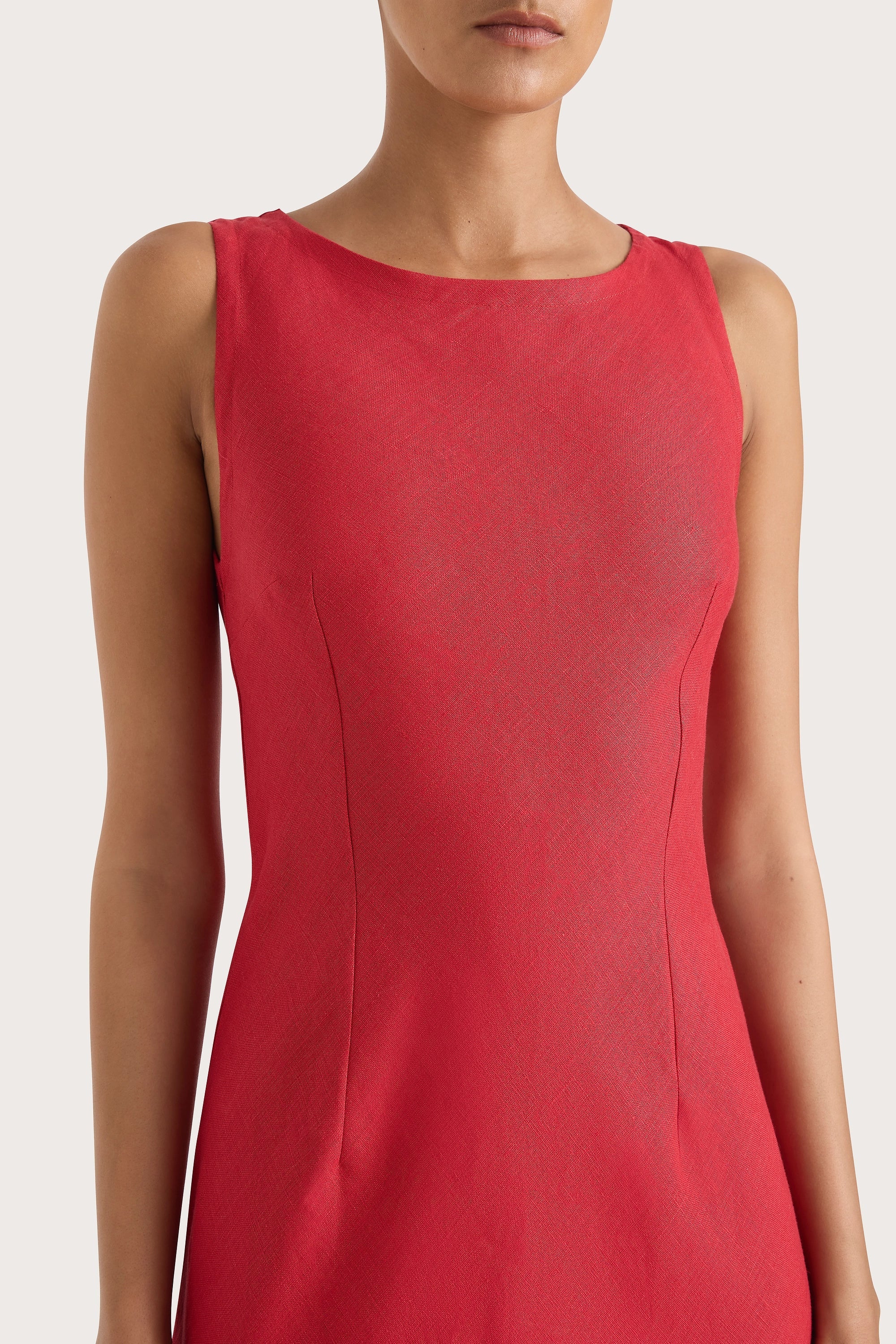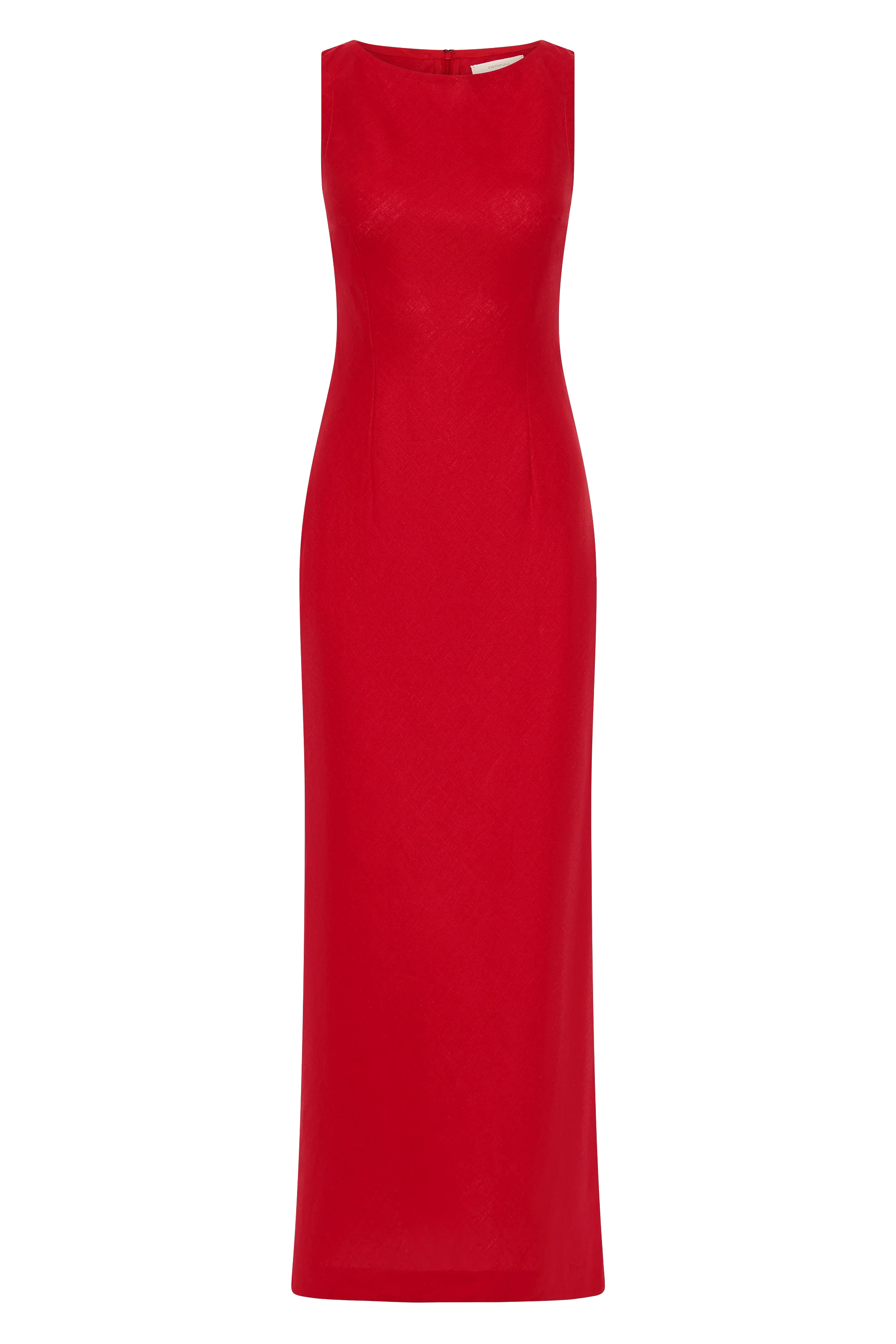 A sleeveless maxi dress with a boat-style neckline. It is softly fitted through the body with a smooth finish that falls into a slight A-line skirt. It is designed from a signature 100% European Flax® linen fabrication in a deep red pink hue. Romantic and feminine, it is the perfect maxi dress for effortless wear and day to night occasions.