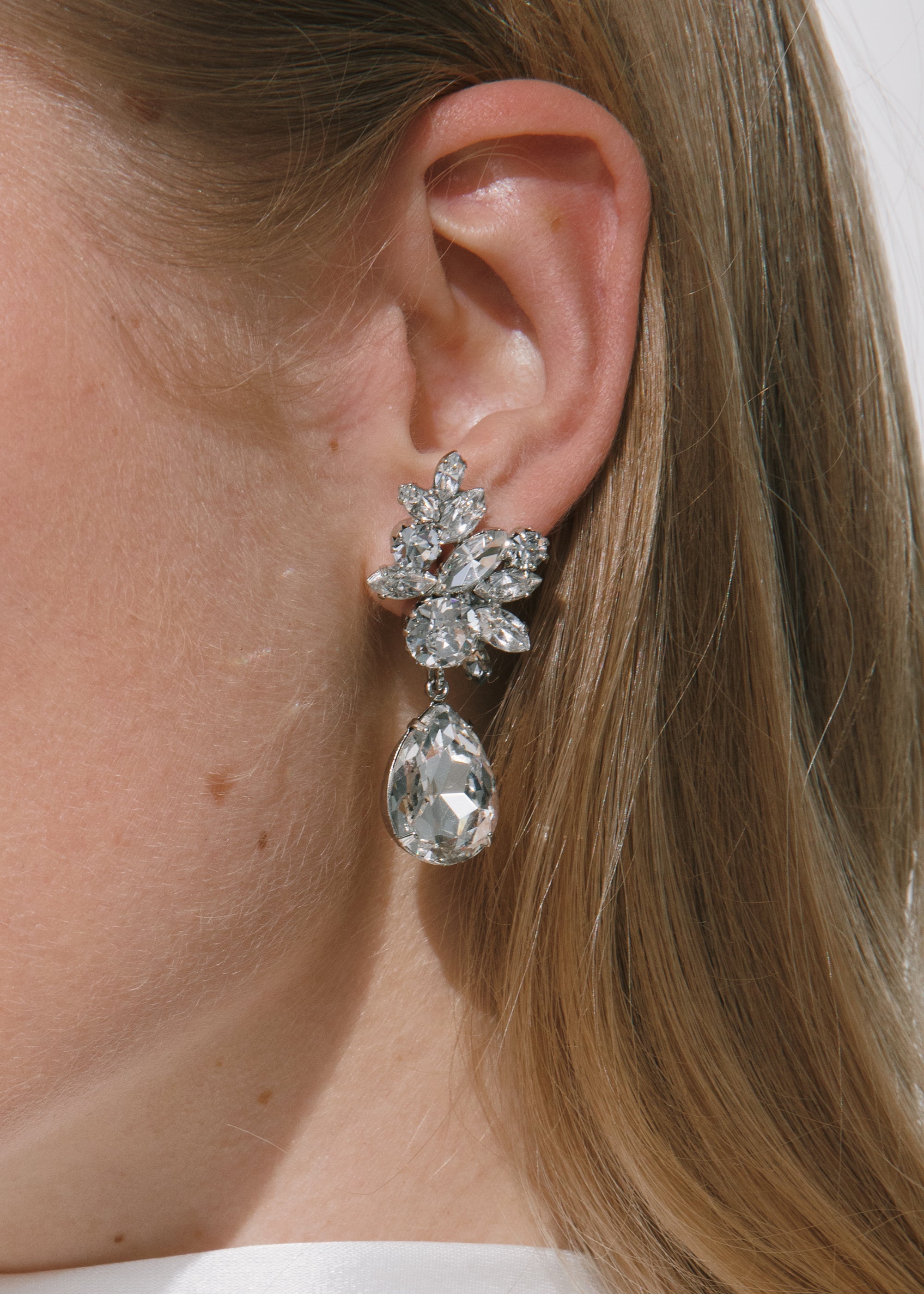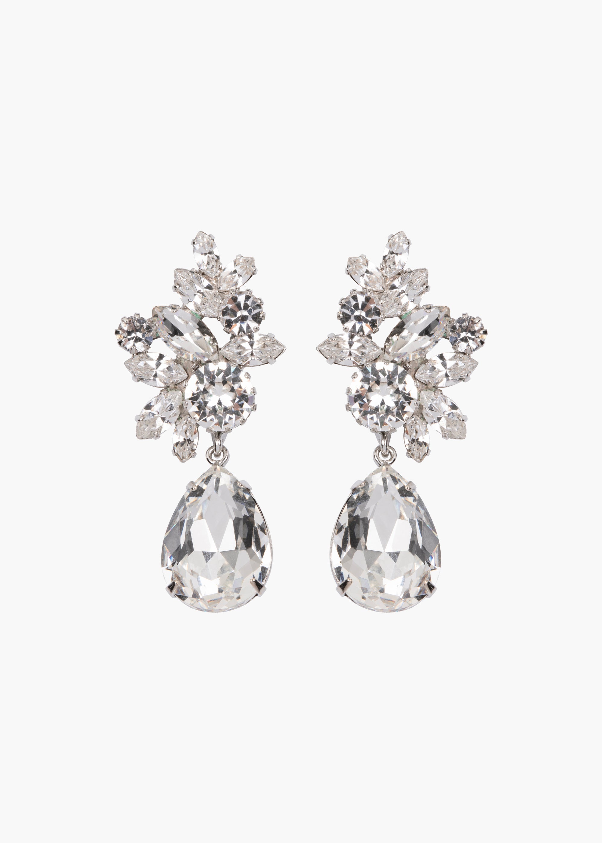 Inspired by Old-Hollywood glamour, the Lynlee Earrings cast a glow too good to resist. Fine Czech crystals form a cluster, trailed by an impressive pear-shaped drop. The dangling stone provides alluring movement, refracting light with your every motion. Dimensions: 1 7/8 in length, 3/4 in width.