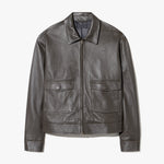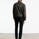Zip up collared jacket in leather. Relaxed fit. Waist length. Dropped shoulder. Regular sleeve length. Center front zip closure. Front patch pockets with hidden snaps. Hidden snaps at sleeve cuff and waistband. Interior chest pocket. Fully lined.