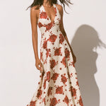 A feminine 1960s-inspired midi dress with a deep V-neckline and tie detail at the back neck. There is subtle stitching and darts under the bust for additional shape. It is semi fitted through the bodice before falling into a flared A-line skirt, cropping below the knees. There is a shirred back waist panel which also allows for extra stretch. Designed from a signature 100% European Flax® linen fabrication in a French-inspired garnet red and cream floral, style with a sandal or kitten heel for a romantic approach to occasionwear.