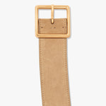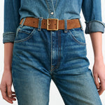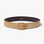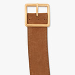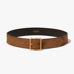 Single layer belt in Italian vachetta leather. Square buckle in antique brass finish. Contoured to fit around the natural shape of the waist.