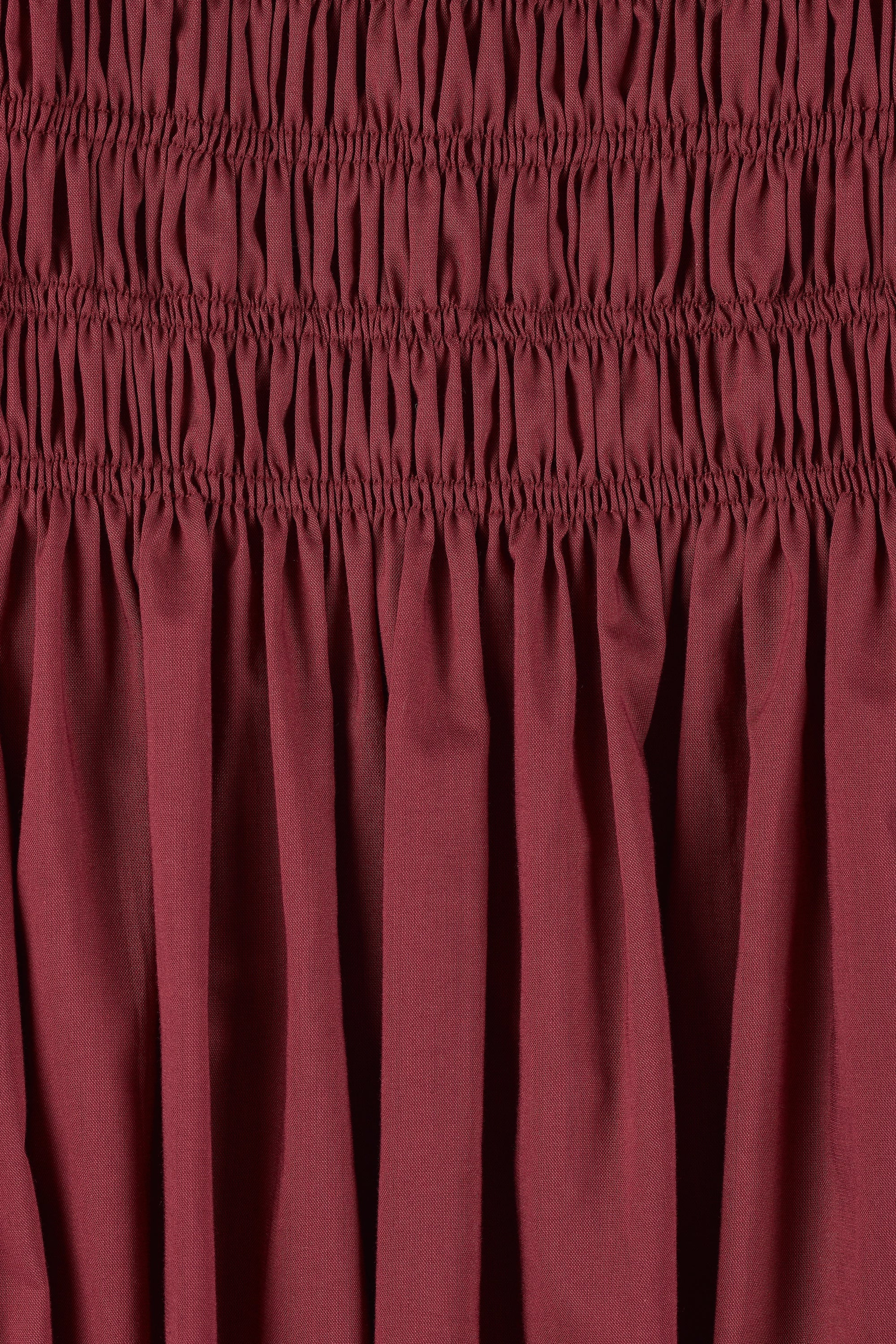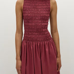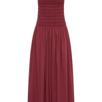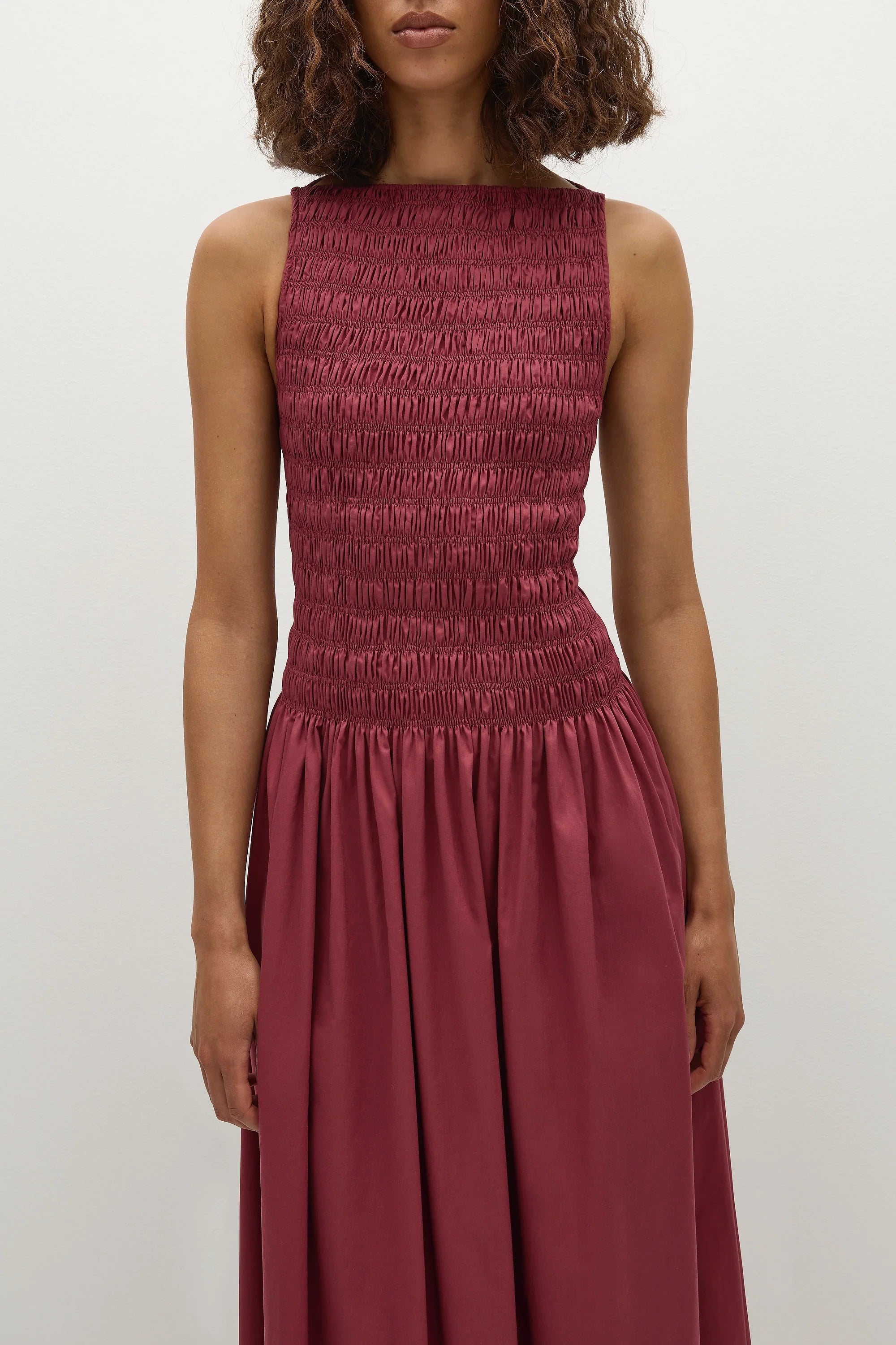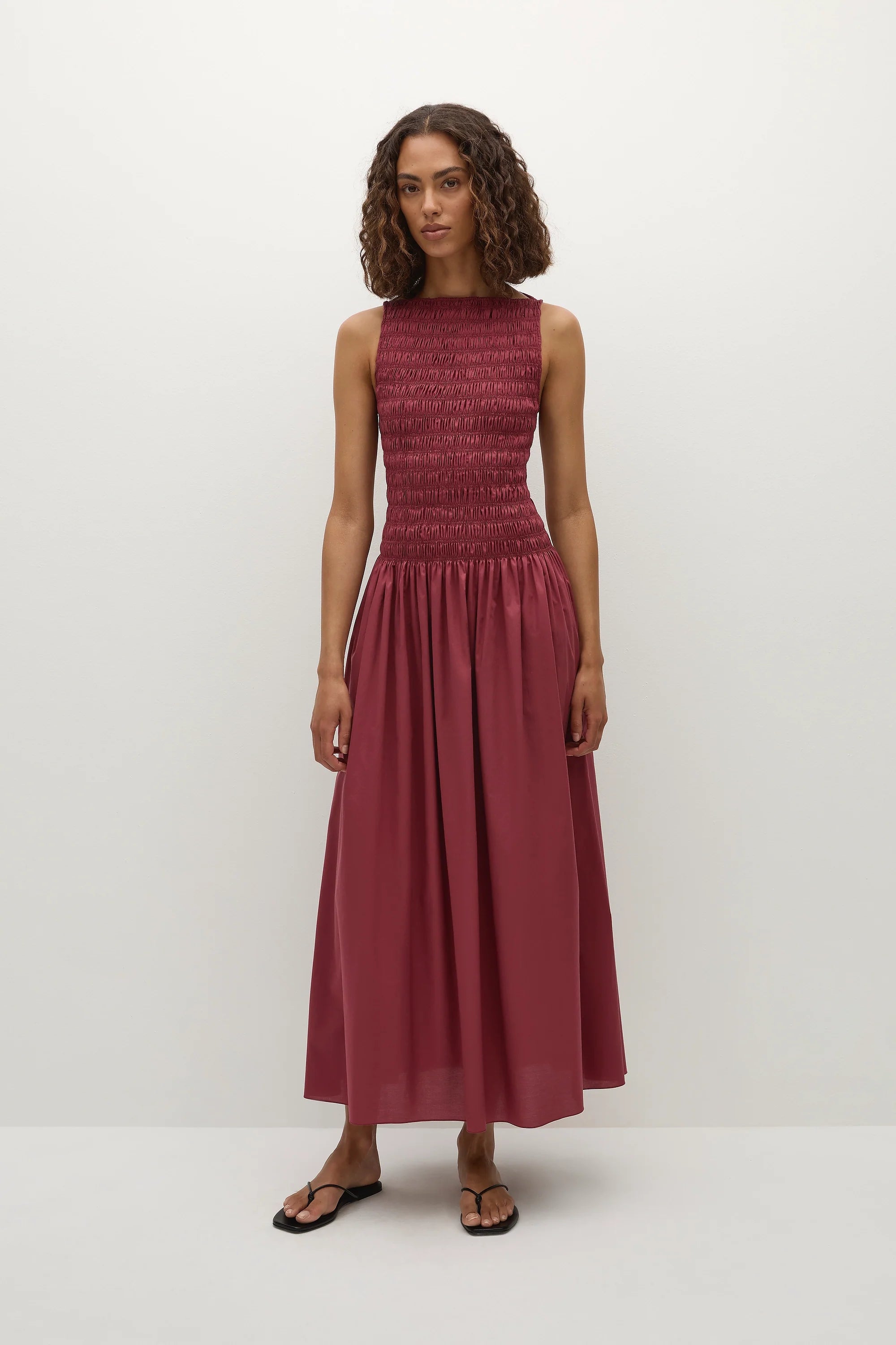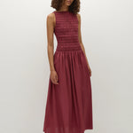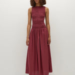 A vintage-inspired, sleeveless midi dress with a high square neckline. Shirred through the bodice for additional stretch, it is gathered at the waist when then falls into a soft A-line skirt that crops above the ankles. Designed from a signature 100% BCI Certified organic cotton in a warm rhubarb red, it offers throw-on throw-off appeal for vacation dressing.
