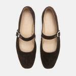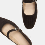 Mary Jane, handcrafted in chocolate corduroy with buckle-fastening, in a new sacchetto construction, with a soft cushioned calf leather insole and grosgrain piping. 10mm heel. Made in Italy.