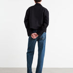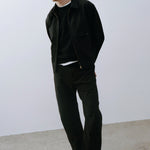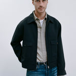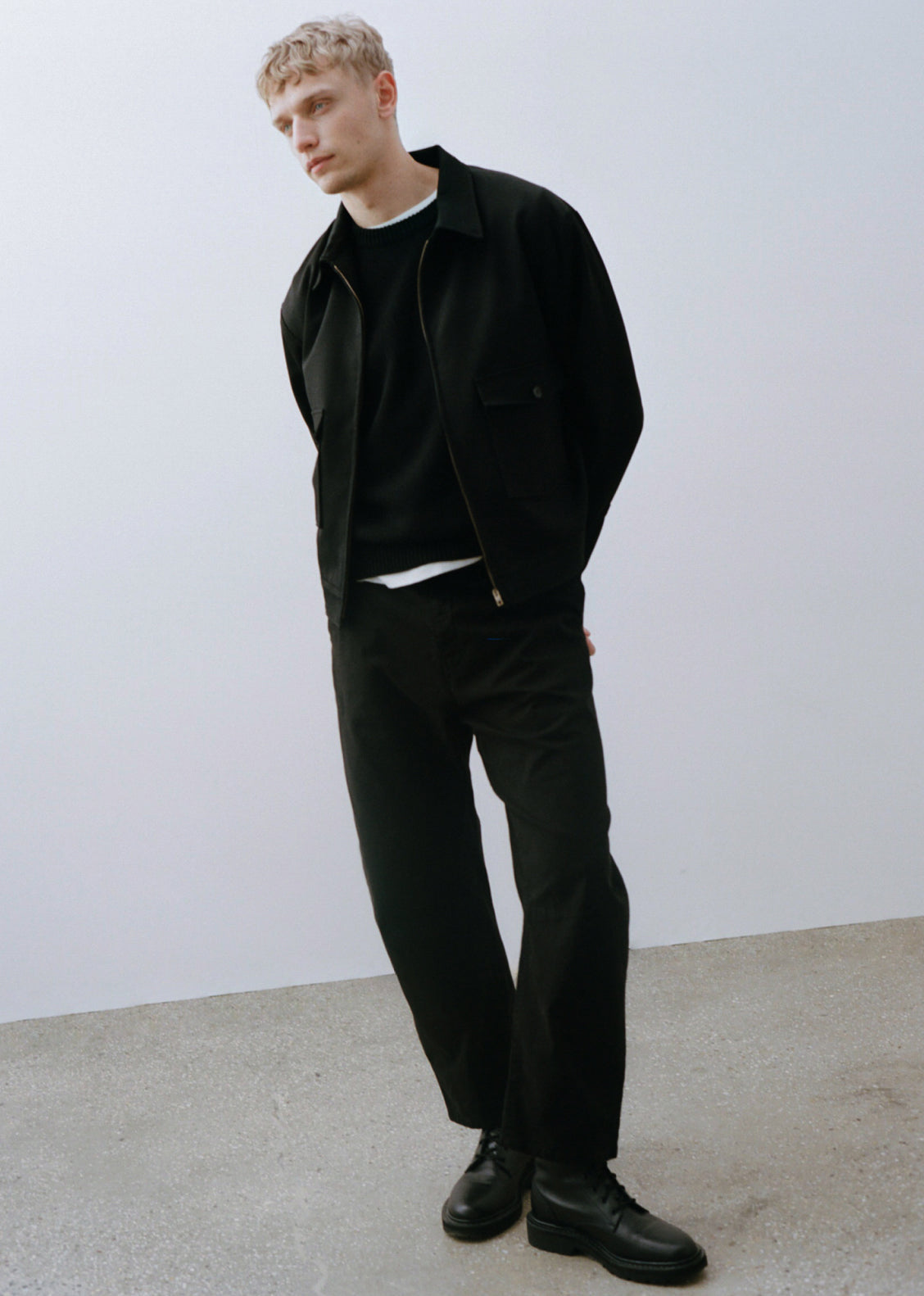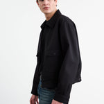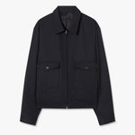 Relaxed, boxy zip up collared jacket in wool. Slightly dropped shoulder. Center front zip closure. Front patch pockets. Horn buttons at sleeve cuff and waistband. Interior chest pocket. Not constructed. Fully lined.