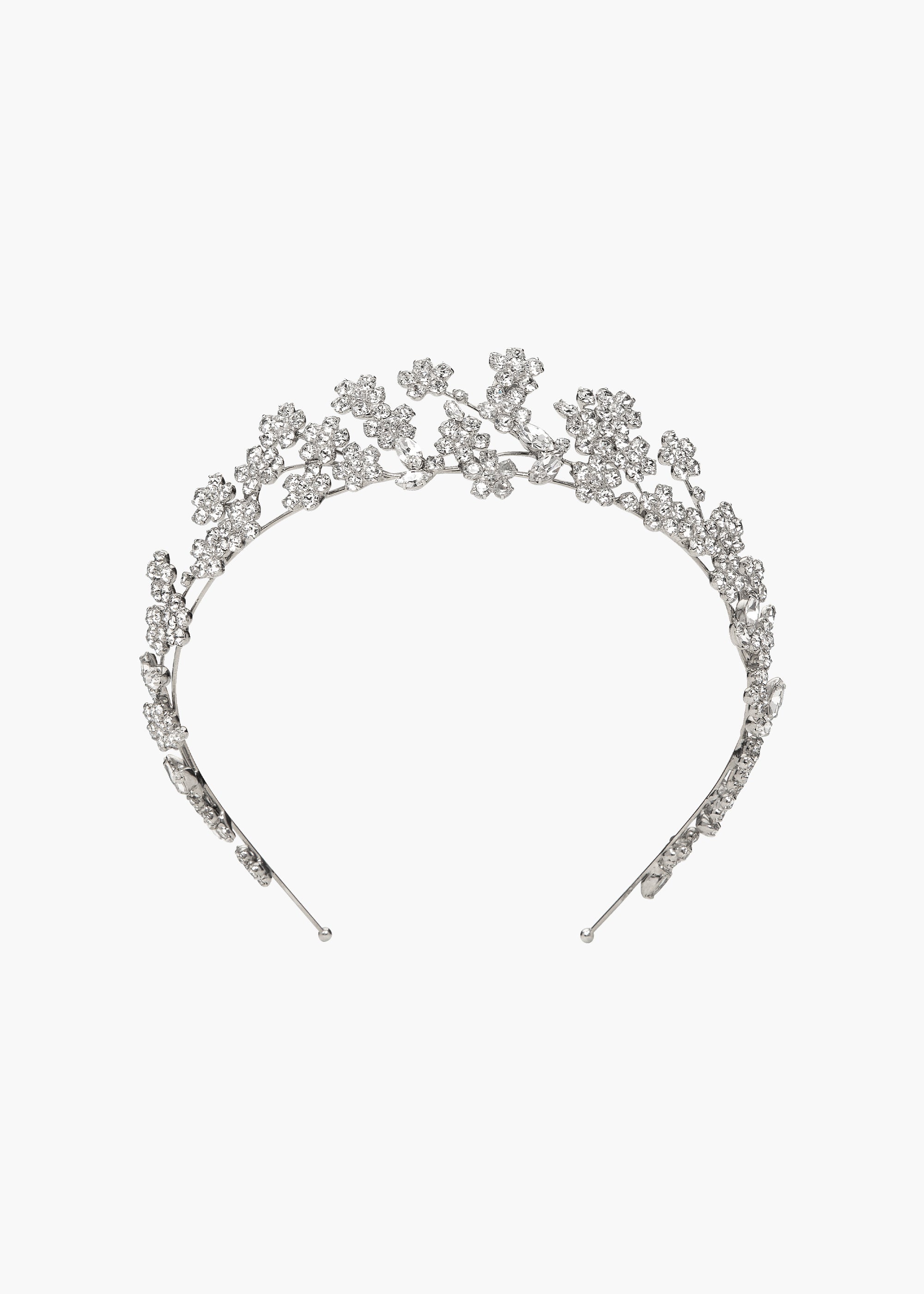 As its moniker suggests, the Meadow Tiara is a poetic composition of flowers, situated to appear carried by the breeze through a meadow. Rendered in fine crystal, our classic floral motif is organically scattered in an asymmetrical arrangement, with regal height and curved shape that is flattering on every face. Made by hand in New York, it sits on a flexible wire base, for comfortable yet secure placement in the hair. Pair with the matching Violet Stud Earrings.