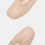 Mica Flat with soft elastic trim in supple fawn lambskin leather with a cushioned calf leather insole and 10mm heel. Made in Italy.
