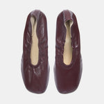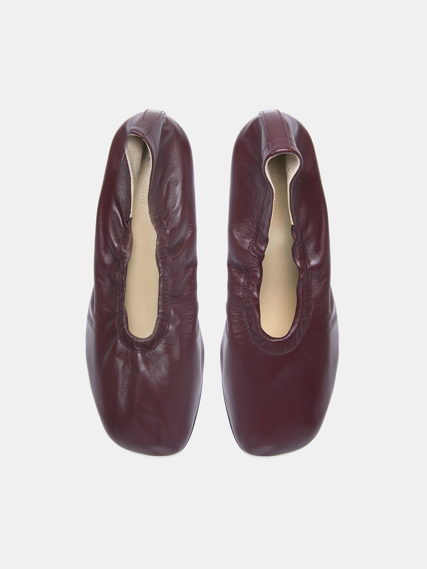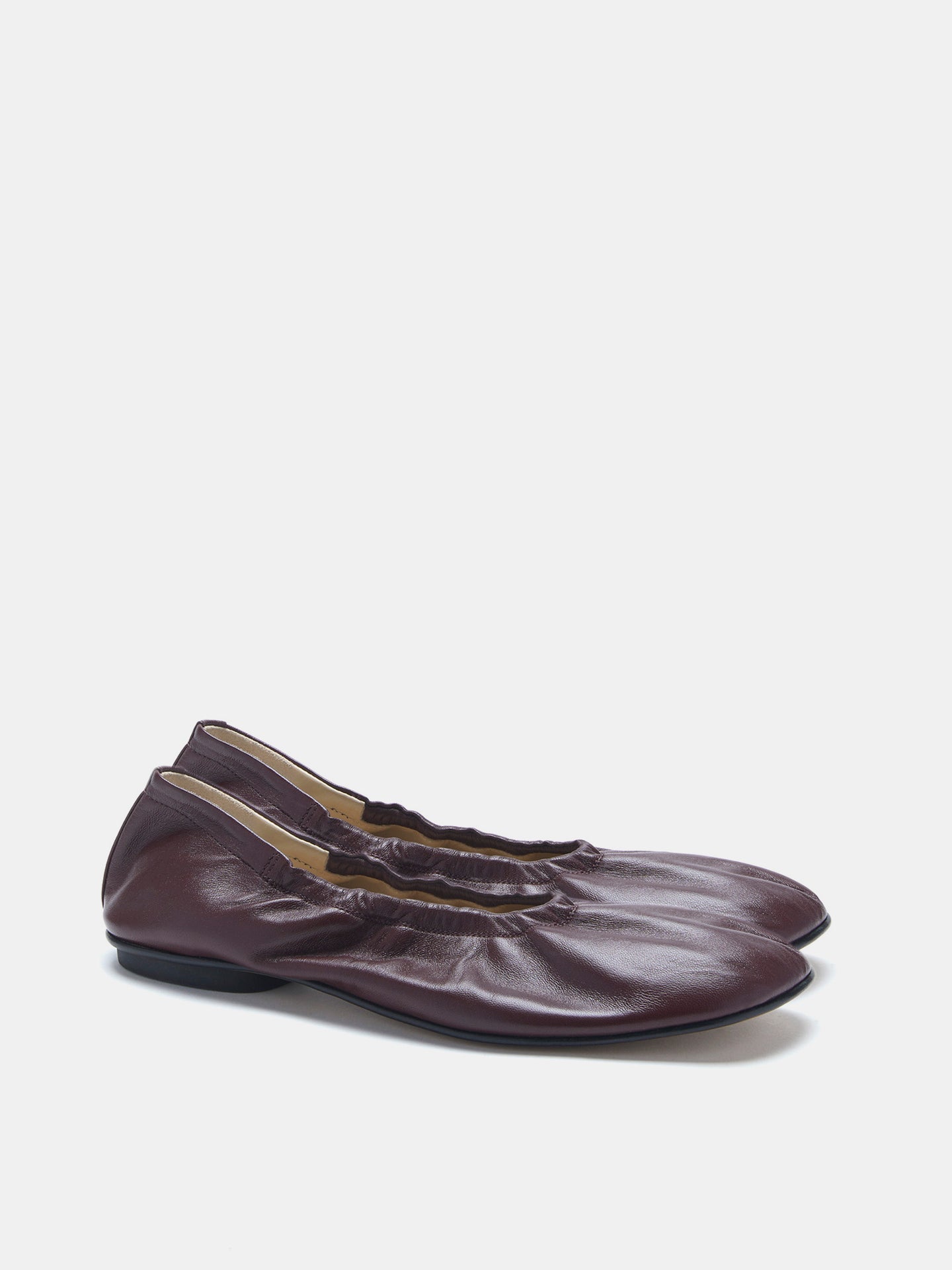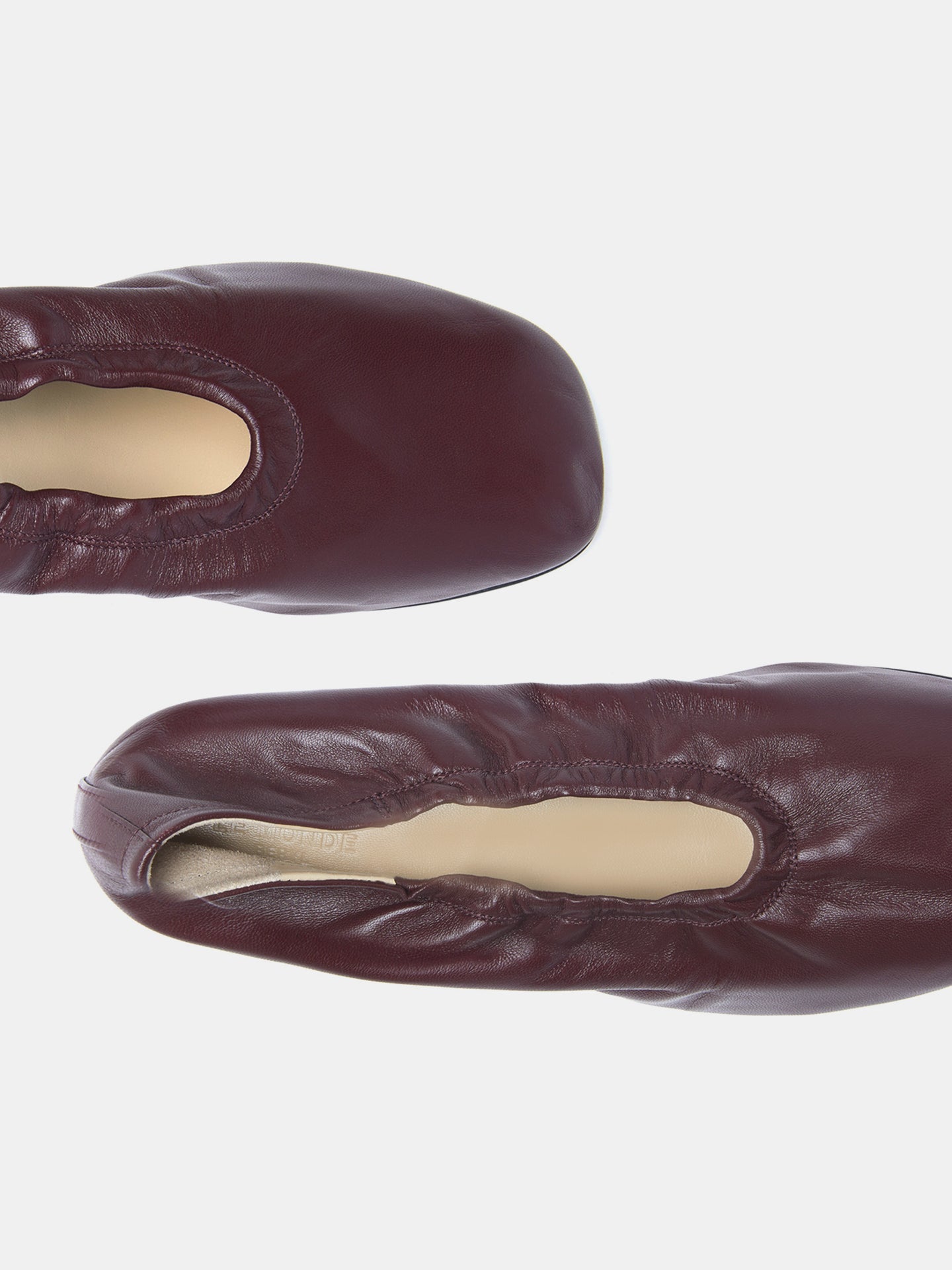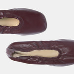 Mica Flat with soft elastic trim, handcrafted in supple oxblood lambskin leather with a cushioned calf leather insole and 10mm heel. Made in Italy.
