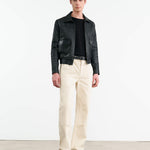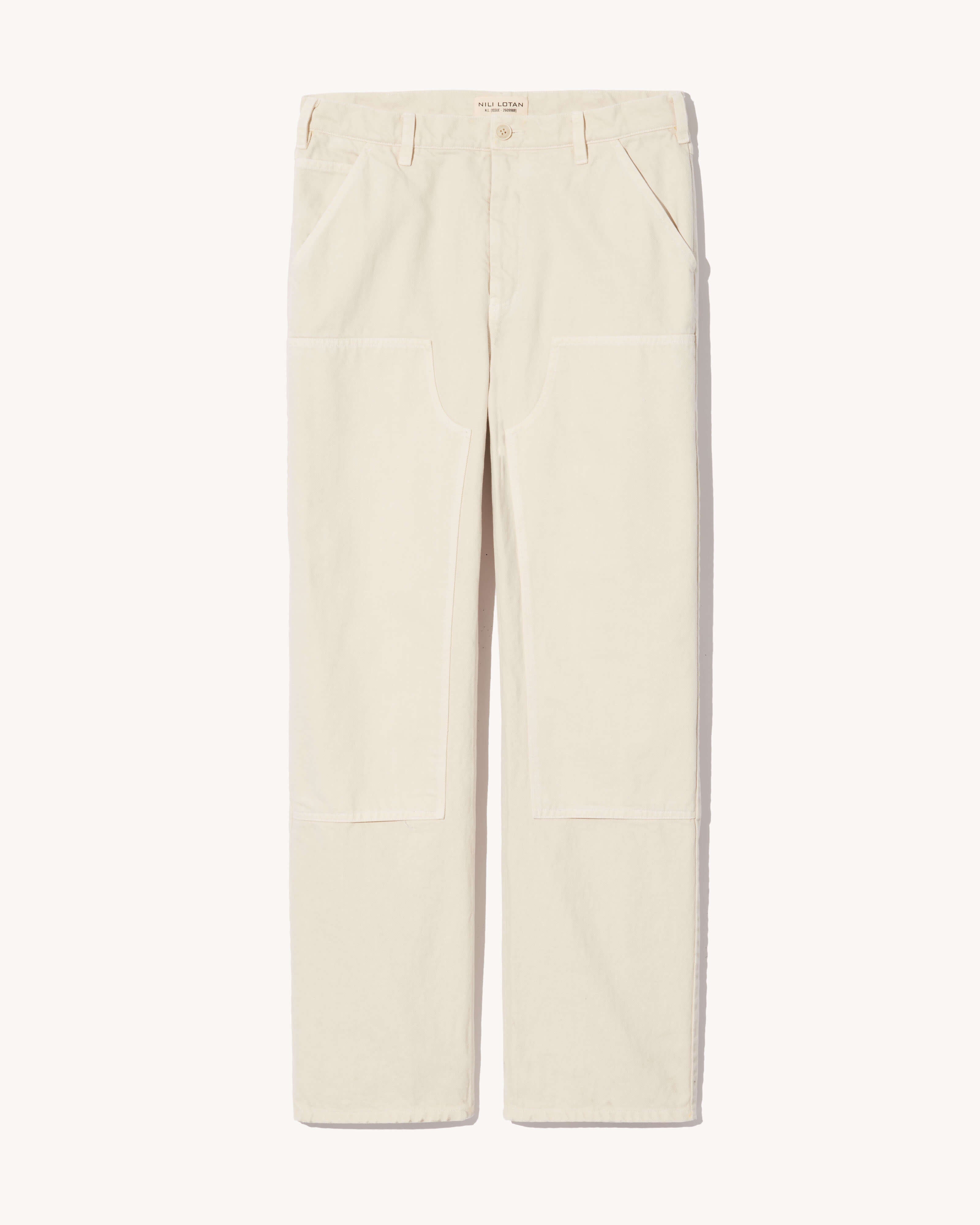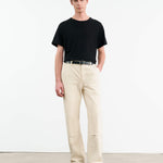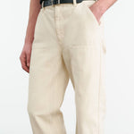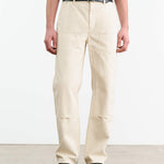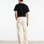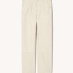 Mid-rise relaxed straight leg pant in Japanese cotton. Slant pockets. Coin pocket. Back patch pockets with top stitching. Welder patch detail. Authentic workwear detail. Zip fly. Logo horn button closure. Belt loops.