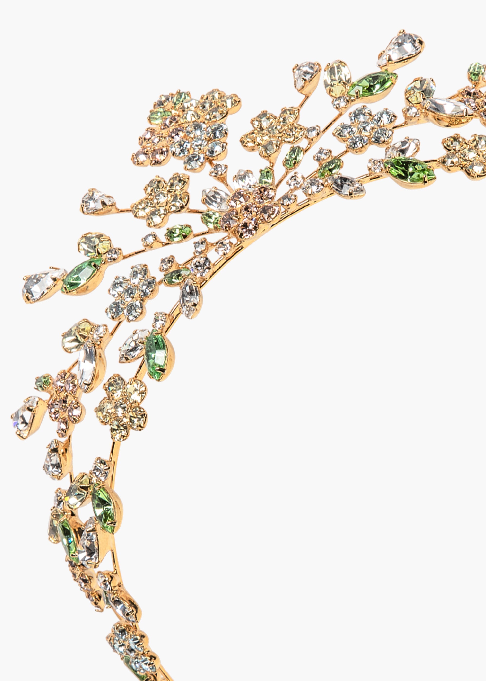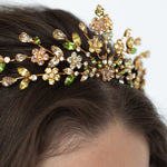 A triumph of design, the Miriam Tiara engenders awestruck glances at every turn. Manifested in fine crystal, its floral sprays veer outward like rays of sunshine, brilliantly arranged to create a memorable finished look. Its flexible base means this headpiece is secure and comfortable to wear with hair up, down, or anywhere in between. Pair with the matching Violet Stud Earrings.