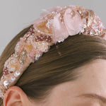 Inspired by vintage millinery, the Miriana Headband is unparalleled in its craftsmanship, channeling the aura of a lush early-autumn garden. Made by hand in New York, this piece features well over a dozen embellishment techniques, from three-dimensional silk chiffon and organza flowers, to bugle beads and crystal details. The silk is draped by hand, and the padded height leaves the exquisite artistry on full display. Dimensions: 1 1/8in H x 2in W
