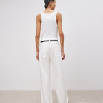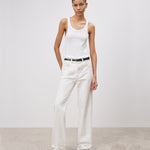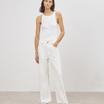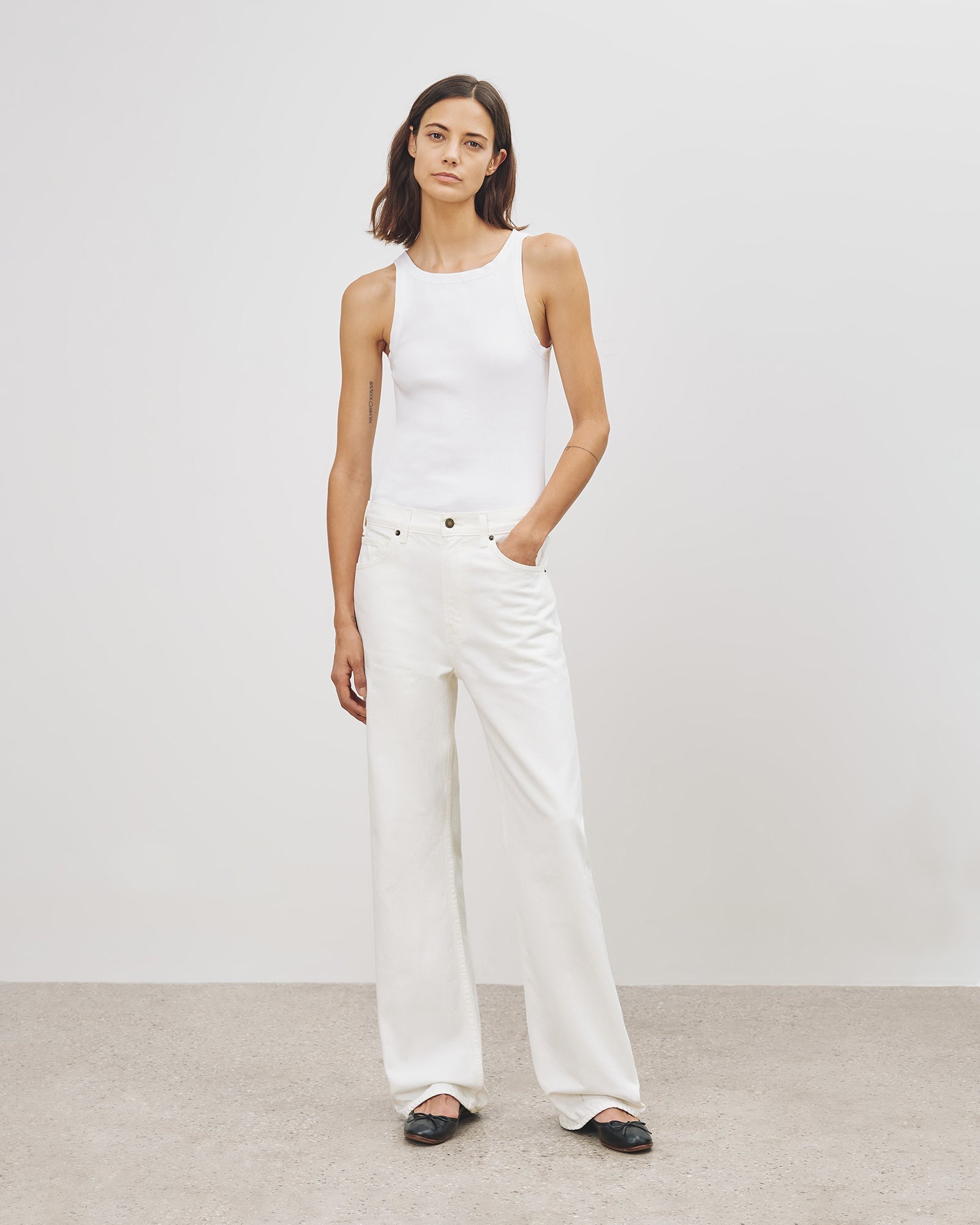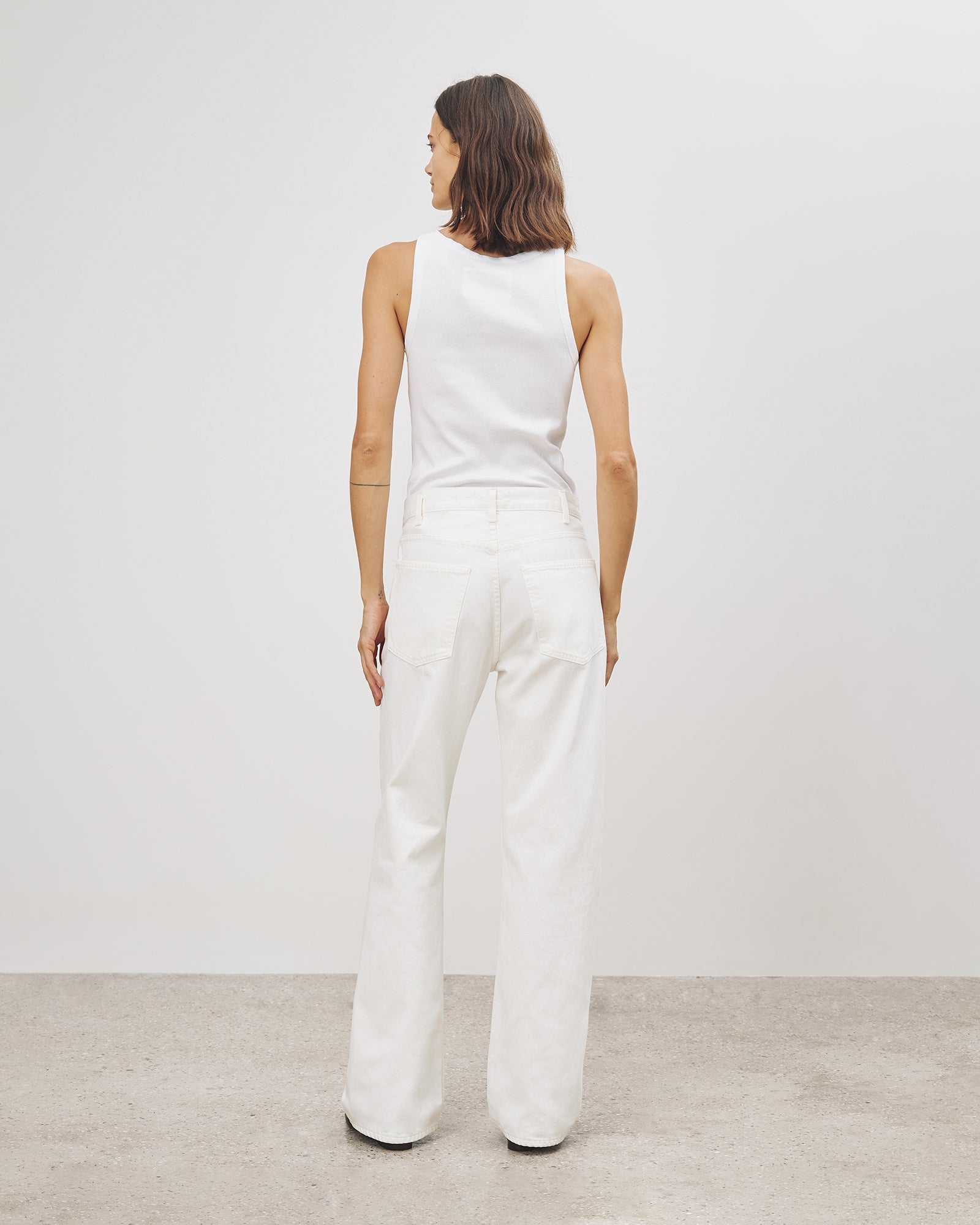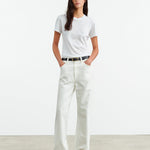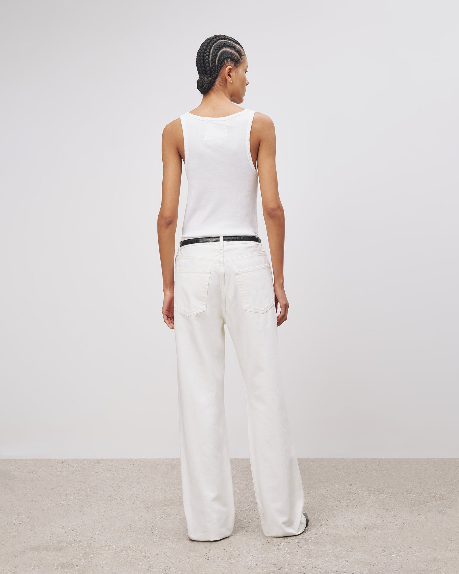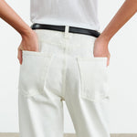 Mid-rise relaxed leg jean in non-stretch Japanese heavyweight crosshatch denim. Five pocket details. Zip fly. Shank closure. Belt loops.