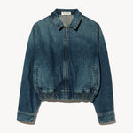 Easy fit denim jacket. Shorter body. Blouson effect at back. Elastic waistband. Welt pockets. Logo zipper at center front. Shank closure at sleeves. Back center seam.