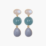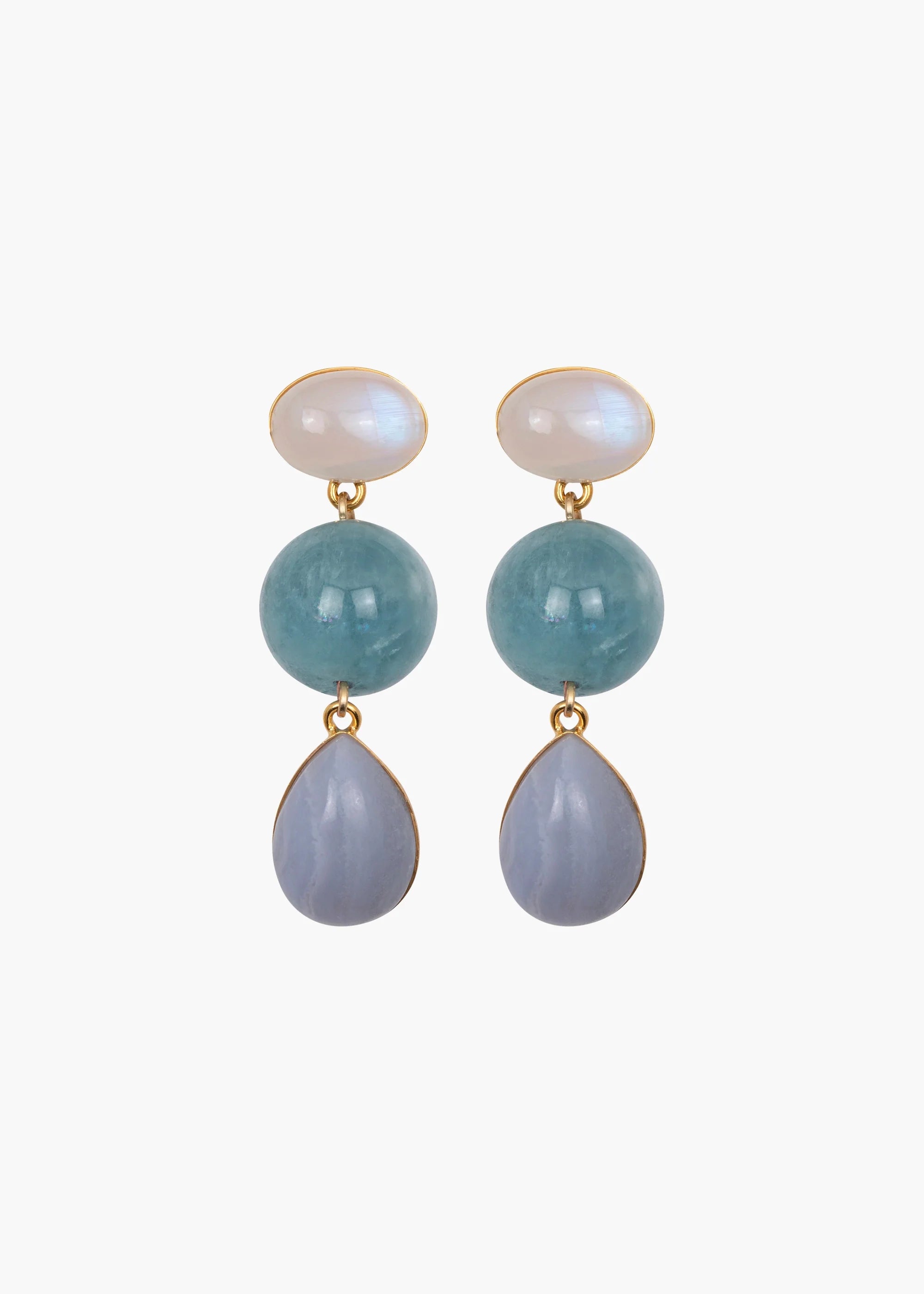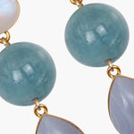 Highlighting the dreamy tones of semi-precious gemstones, the Natalia Earrings boast a painterly palette. Gemstones like moonstone, amethyst, and aquamarine are formed into cabochon stones and oversized beads, playfully calling to mind glistening gumdrops. Made by hand in New York, the nearly invisible 18-karat gold-plated setting is designed to showcase each gemstone's distinct coloring, which makes each pair one-of-a-kind. Dimensions: 2" length