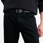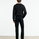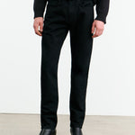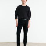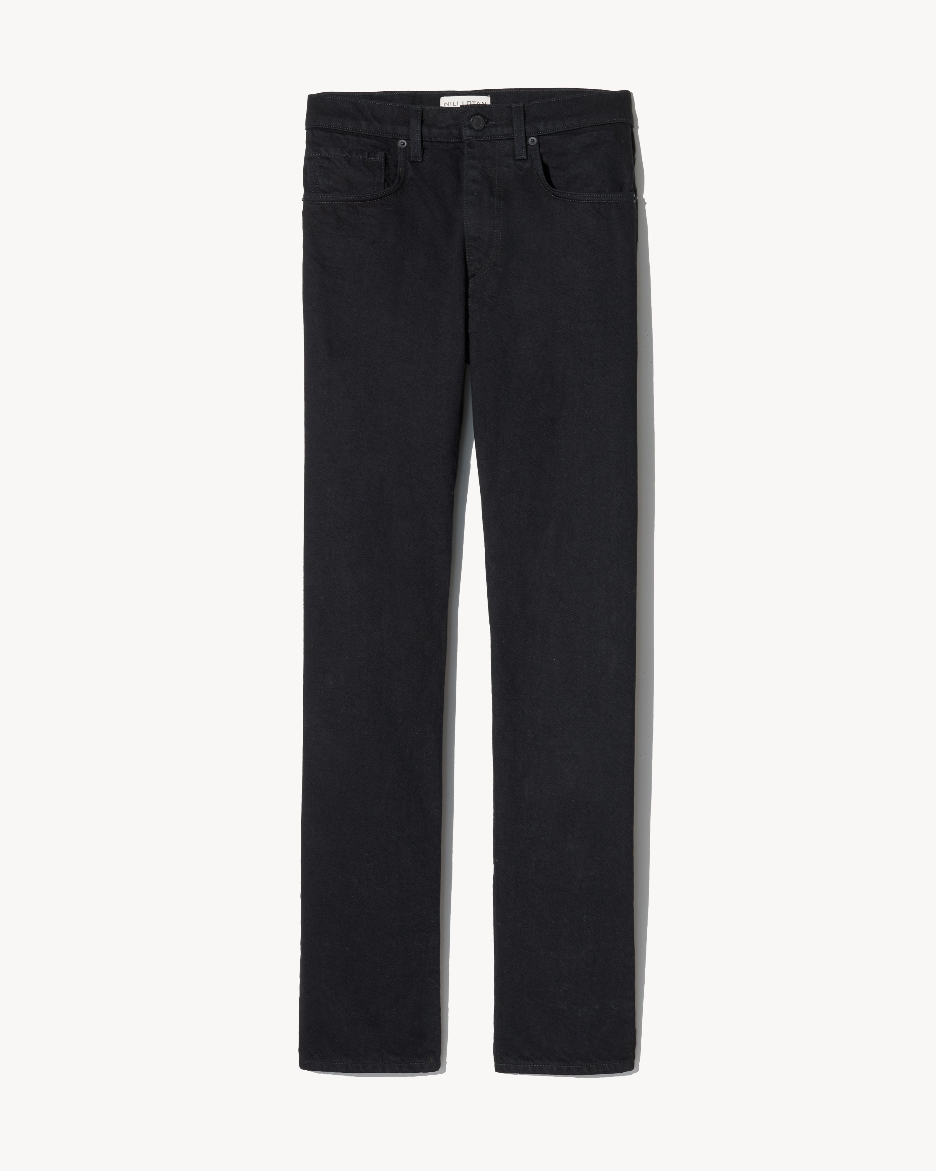 Mid-rise straight leg jean in Japanese non-stretch denim. Five pocket details. Zip fly. Shank closure. Belt loops.