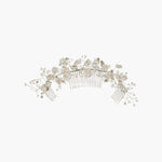 The Nicola Comb evokes the look of baby's breath tucked in the hair, but with a more elegant, lasting effect. Stunning Czech crystals in special cuts combine with pearl details to create the distinctly organic look of this floral swag. With a flexible spine that sits on multiple combs, this is a versatile headpiece that can be wrapped around a chignon, slipped into a French twist, and even doubles as a tiara, pinned at the top of the head. Dimensions: 3.5” in length, 9.5” in length.