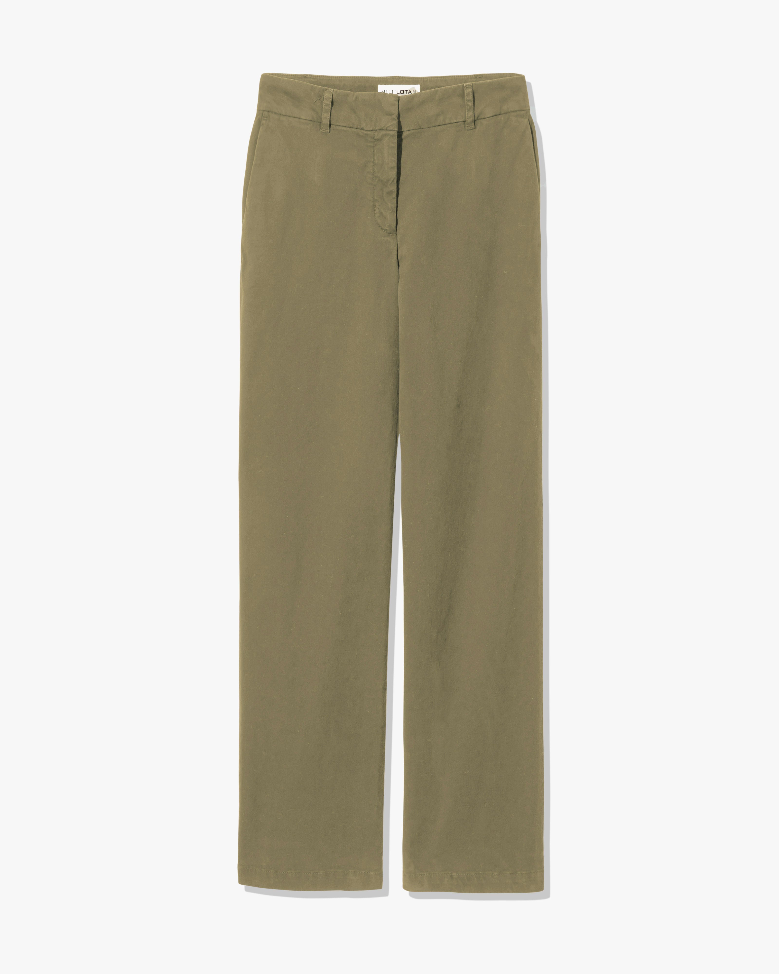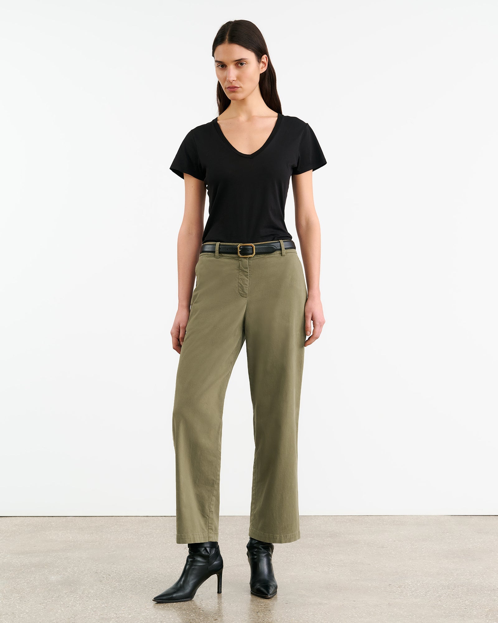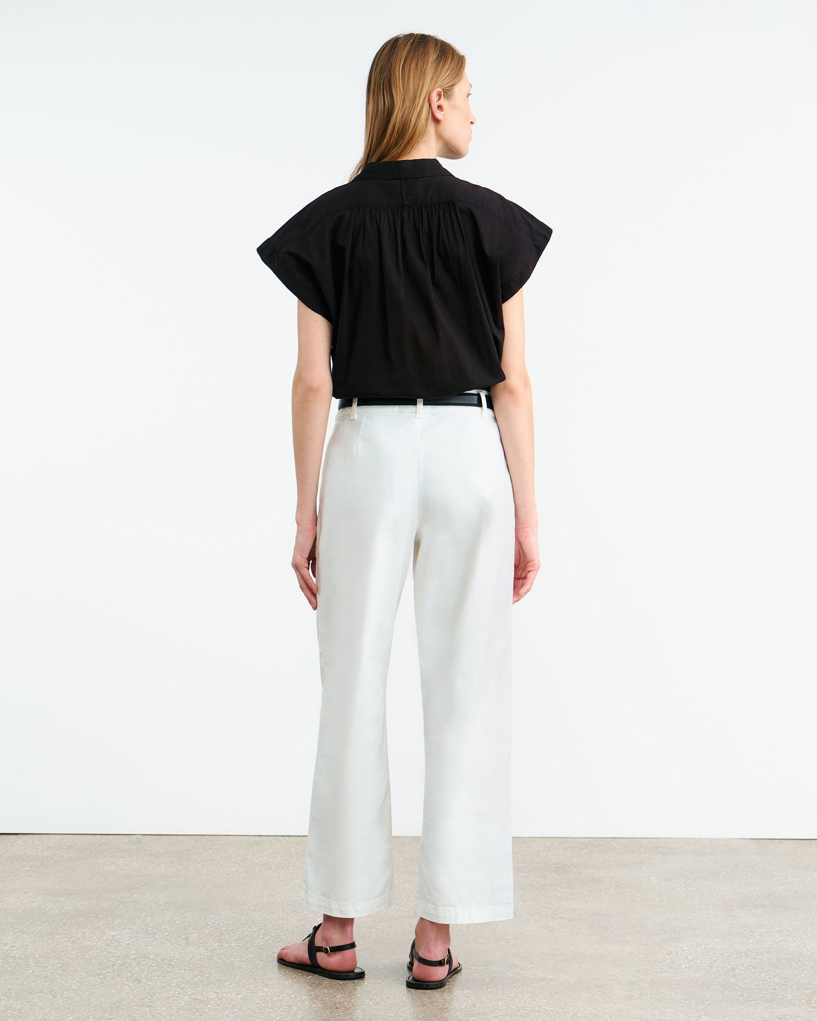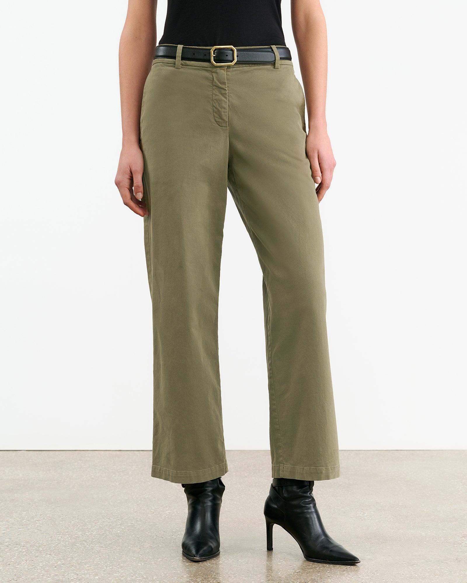Mid-rise, straight leg cropped pant in Italian brushed stretch twill cotton. Curtain waistband. Slash pockets. Back darts.