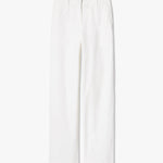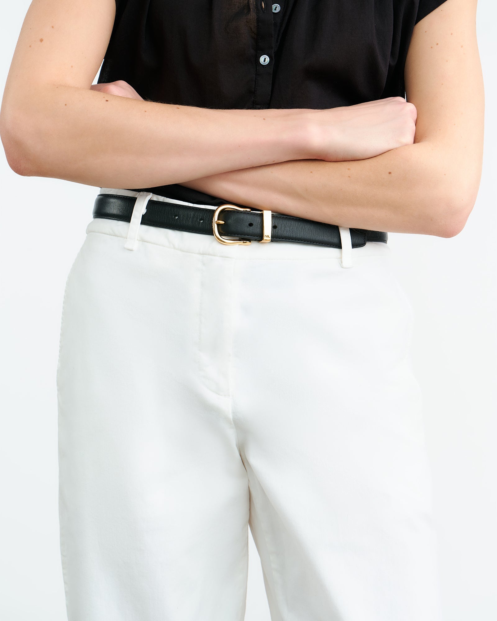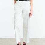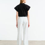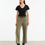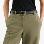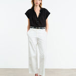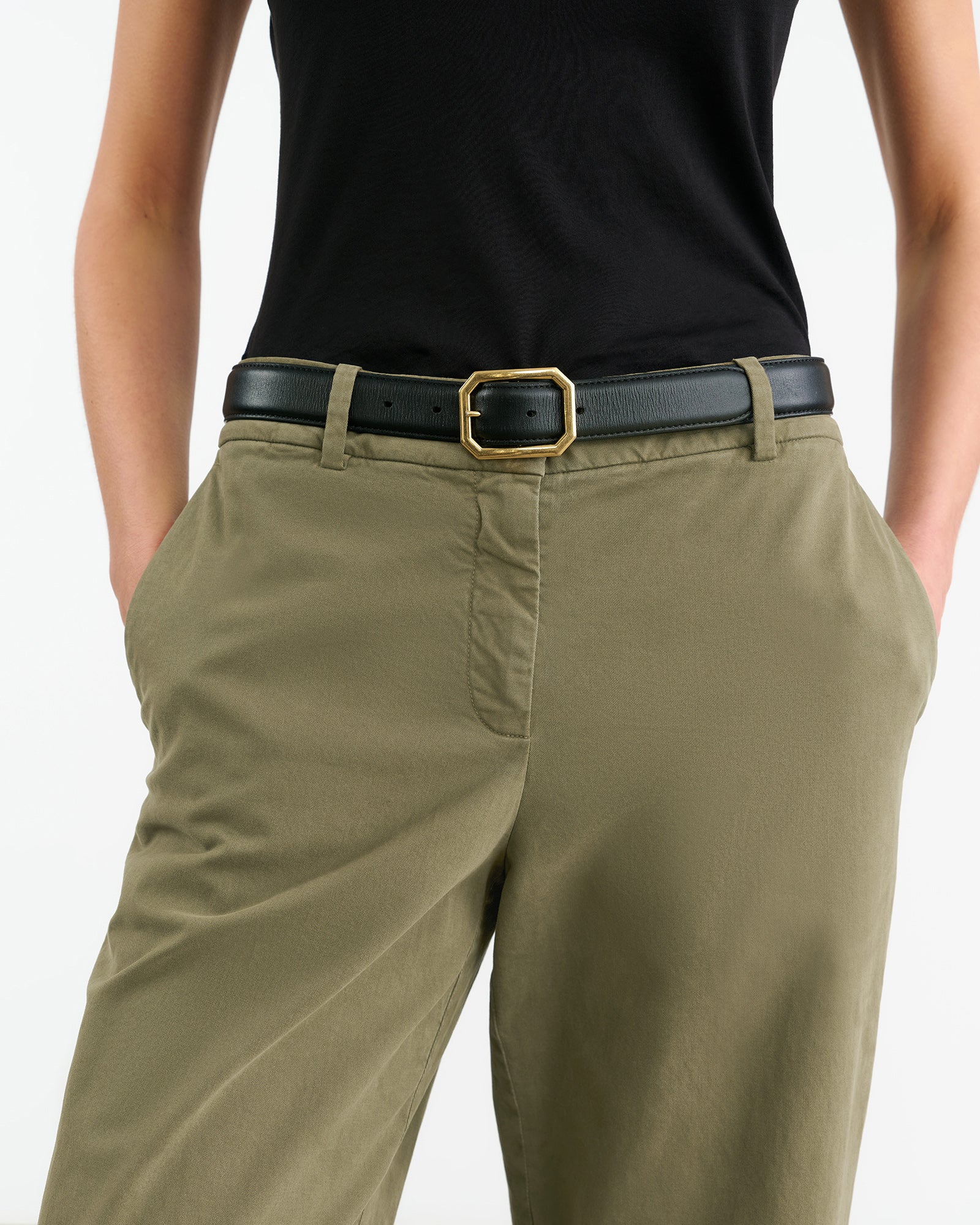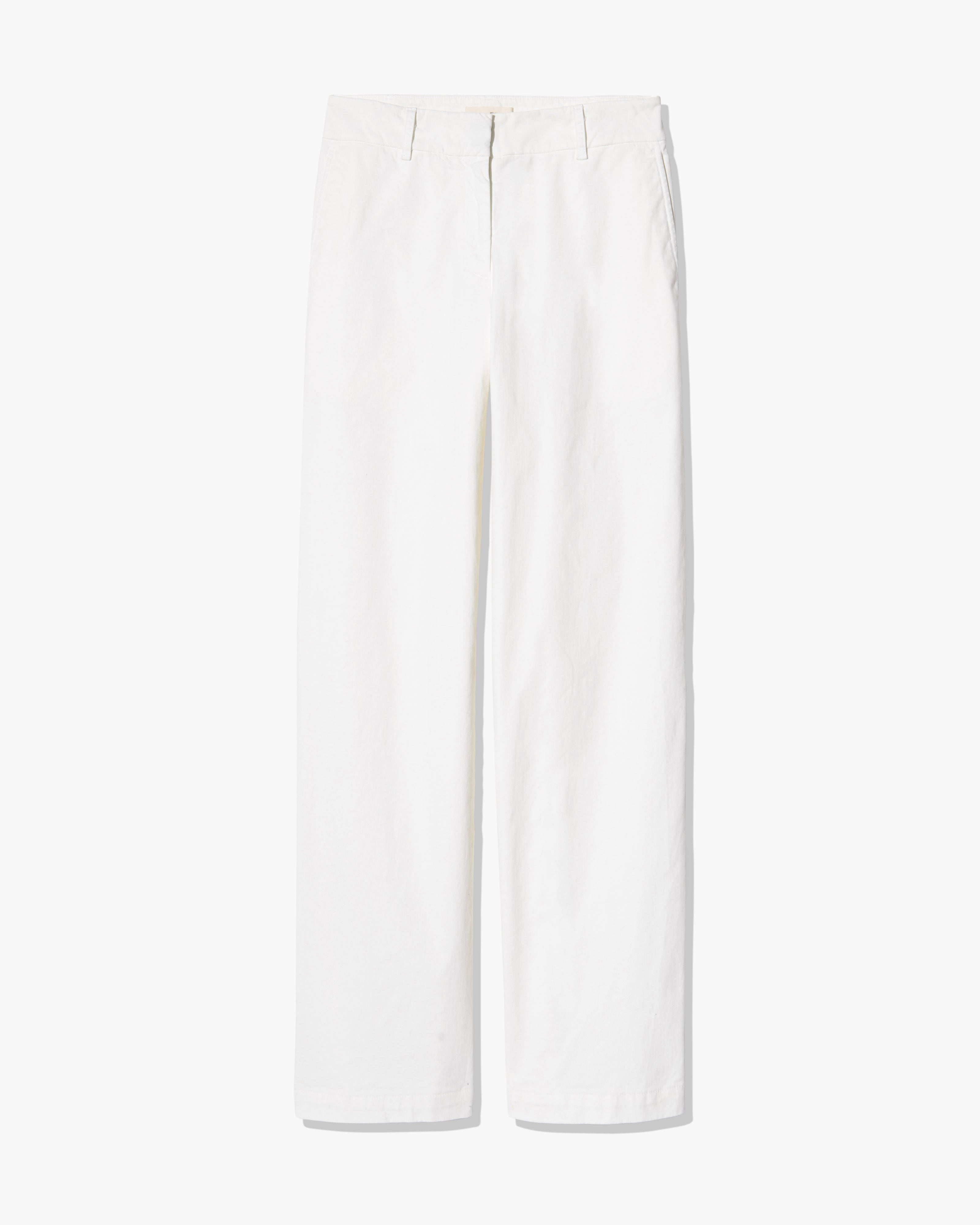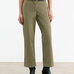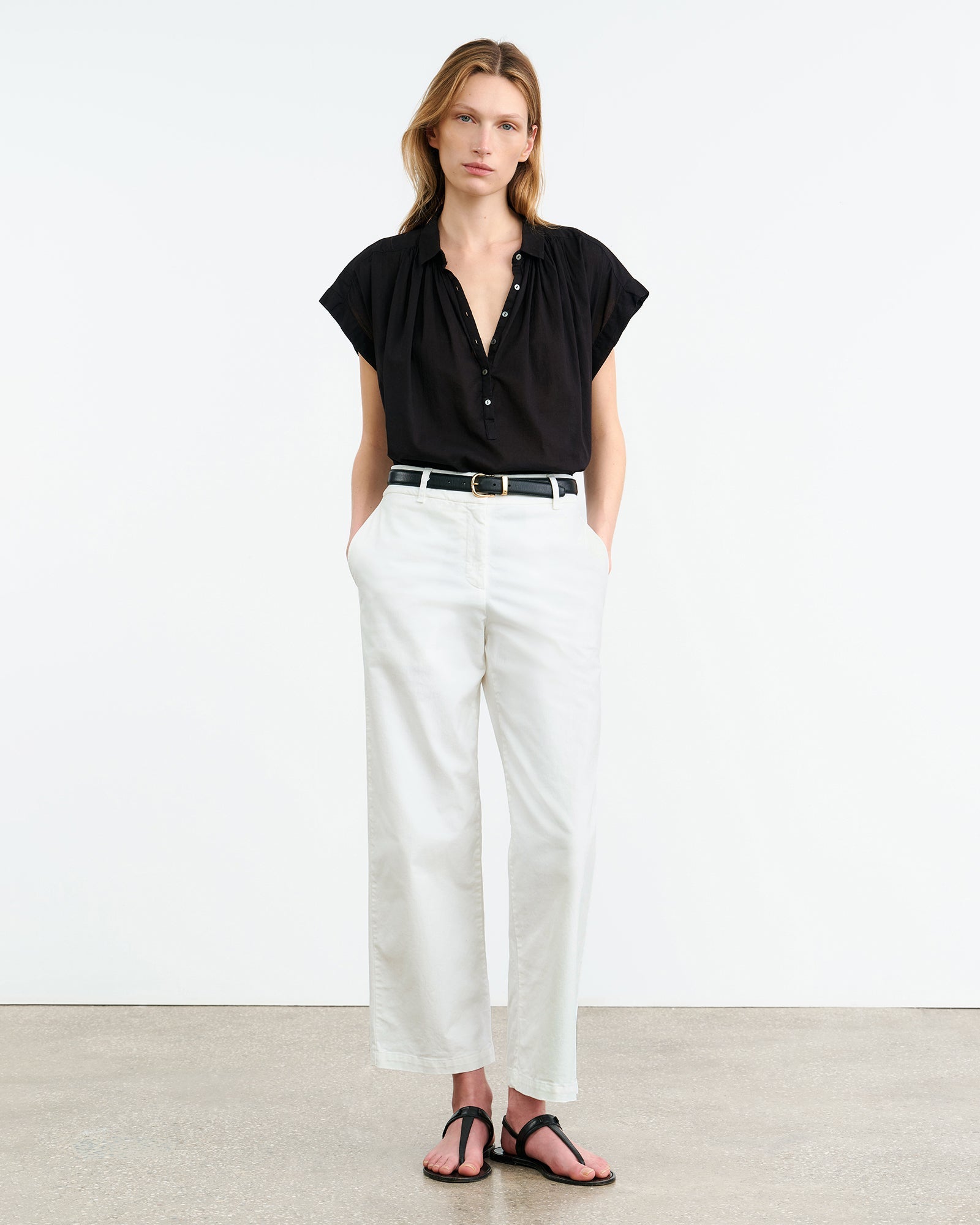 Mid-rise, straight leg cropped pant in Italian brushed stretch twill cotton. Curtain waistband. Slash pockets. Back darts.