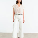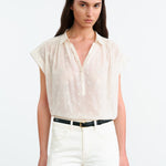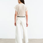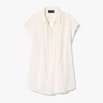 Oversized, voluminous pullover blouse in Indian embroidered voile. Dropped shoulder. Center front half button down with troka buttons. Shirring throughout front and back. Small collar. Shirttail hem. Hanger loop detail at back. Easily able to tuck in.