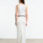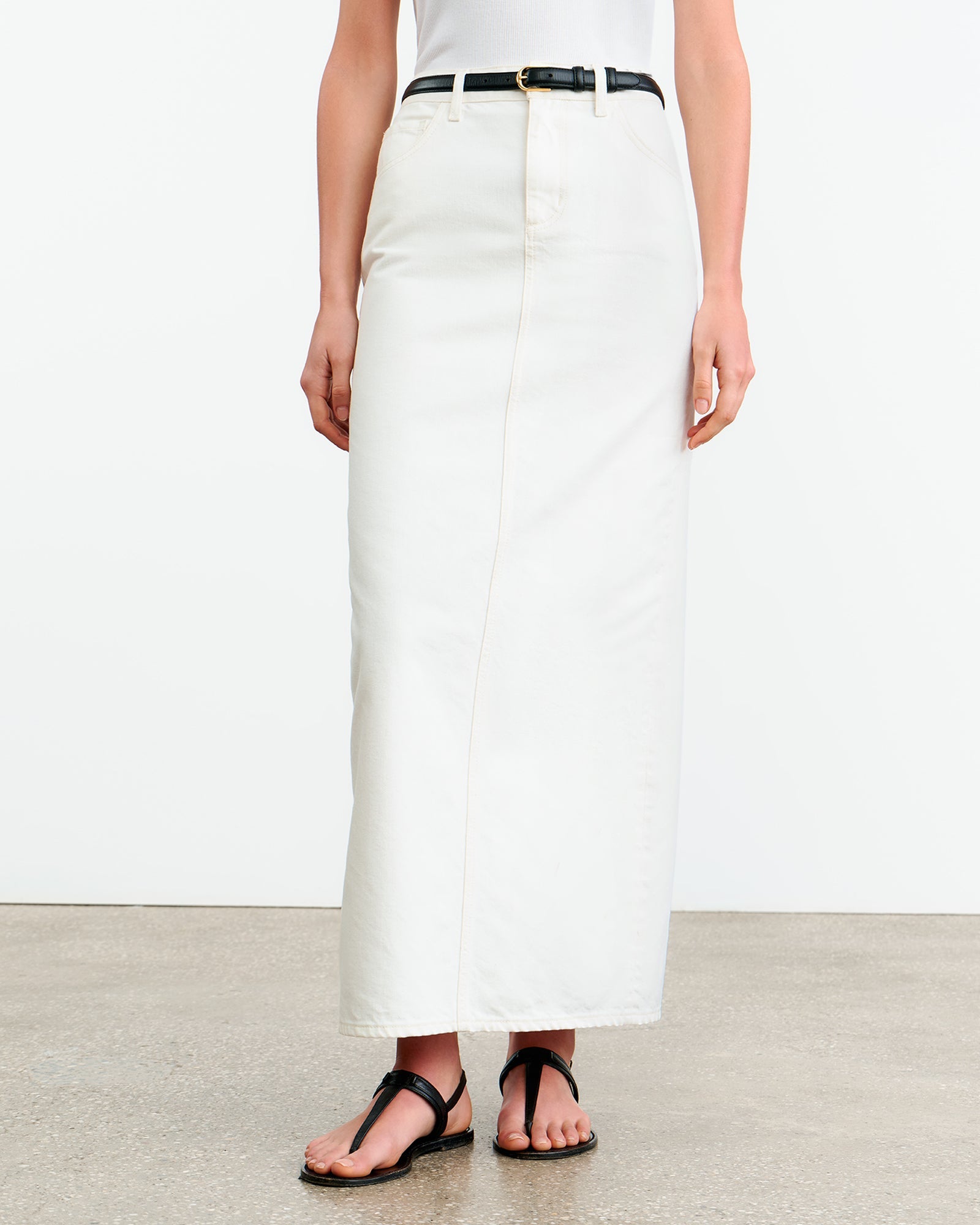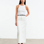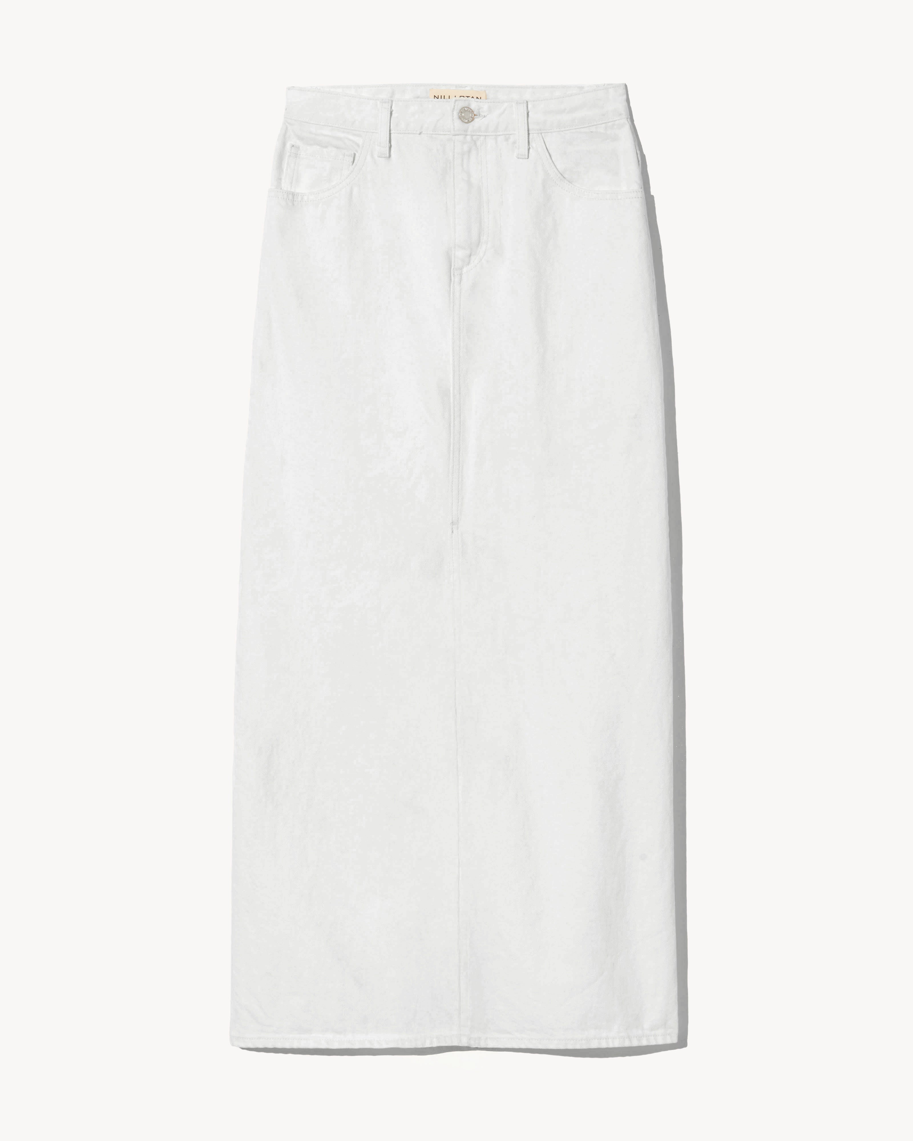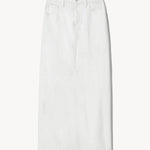 Mid-rise full length skirt in Japanese denim. Shank closure. Zip fly. Five pocket detail. Belt loops. Back vent.