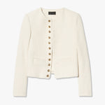 Slim cropped jacket in Italian cotton blend tweed bouclé. Shoulder pads. Welt pockets. Decorative signature crest buttons in antique brass at front and cuff. Back seams. Fully lined.