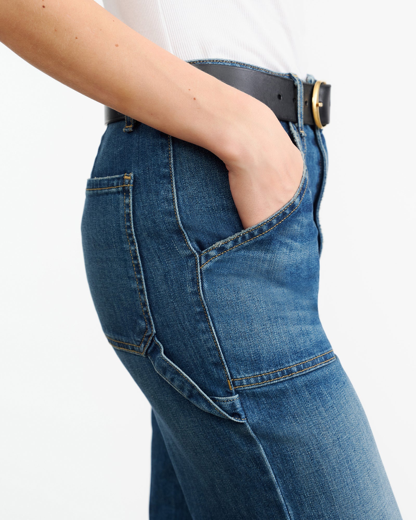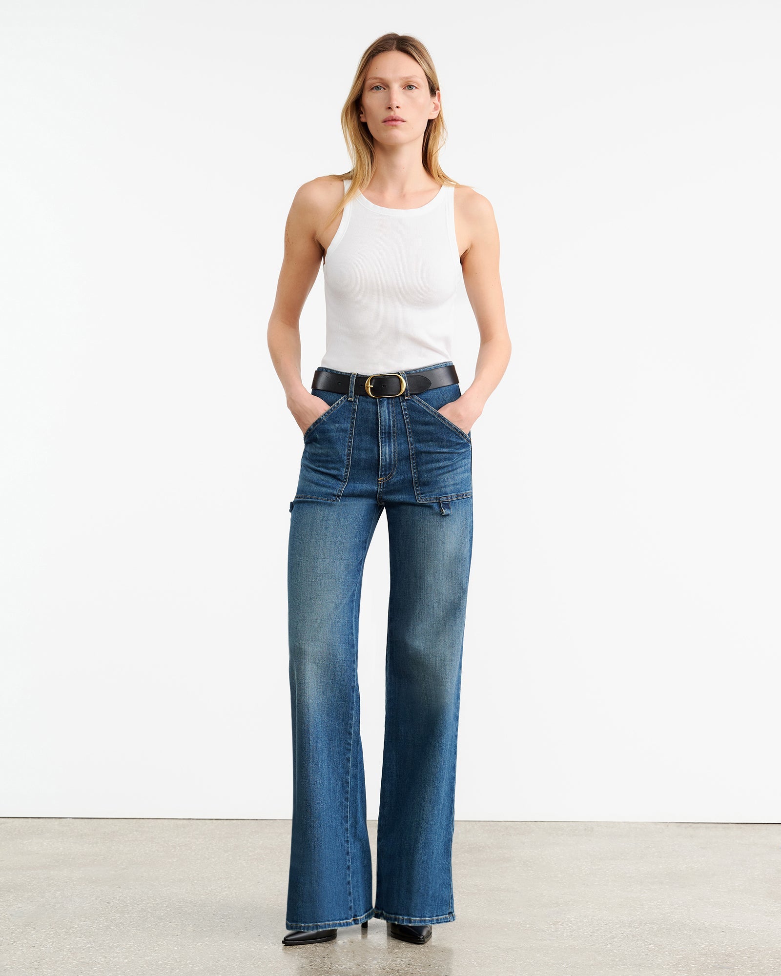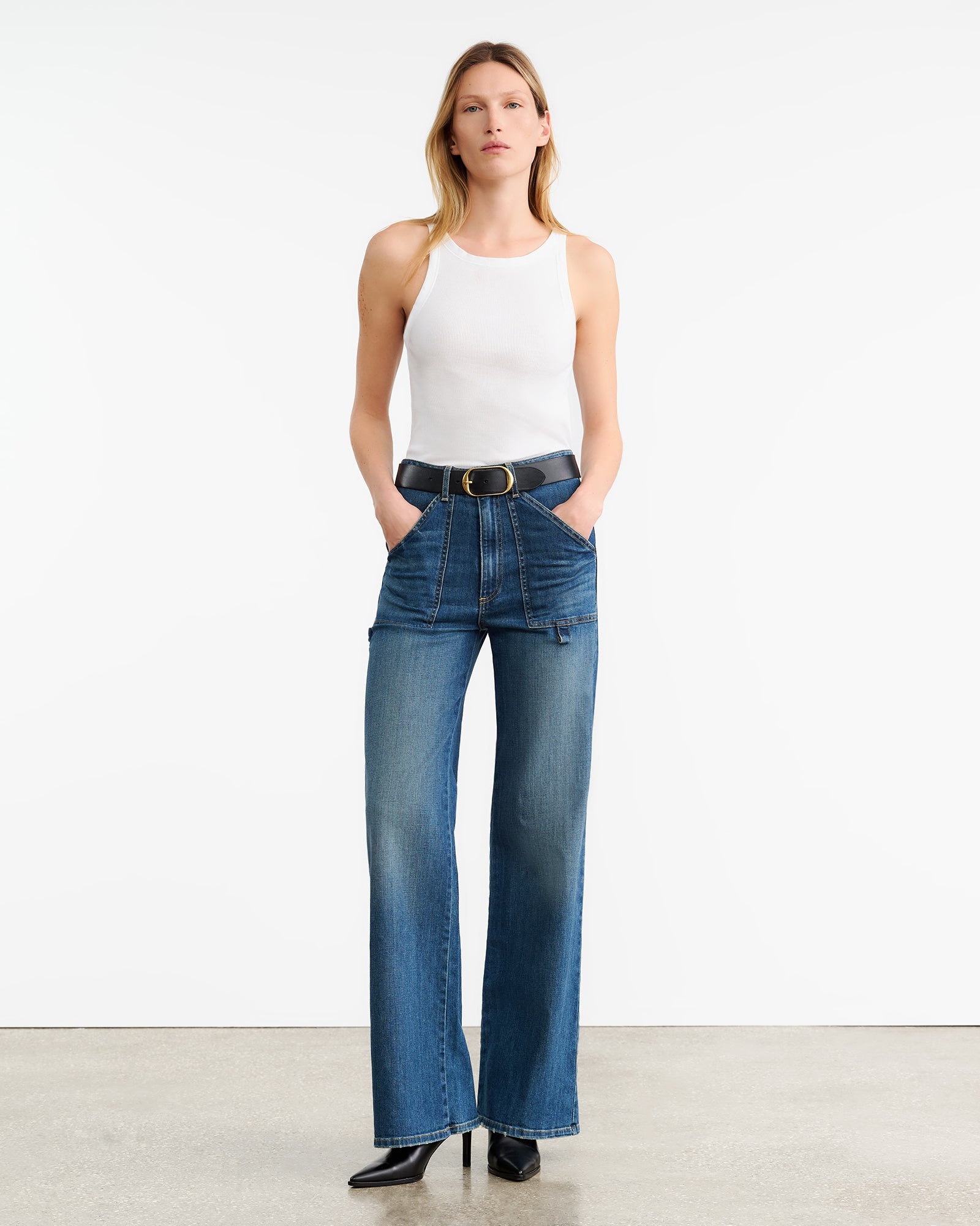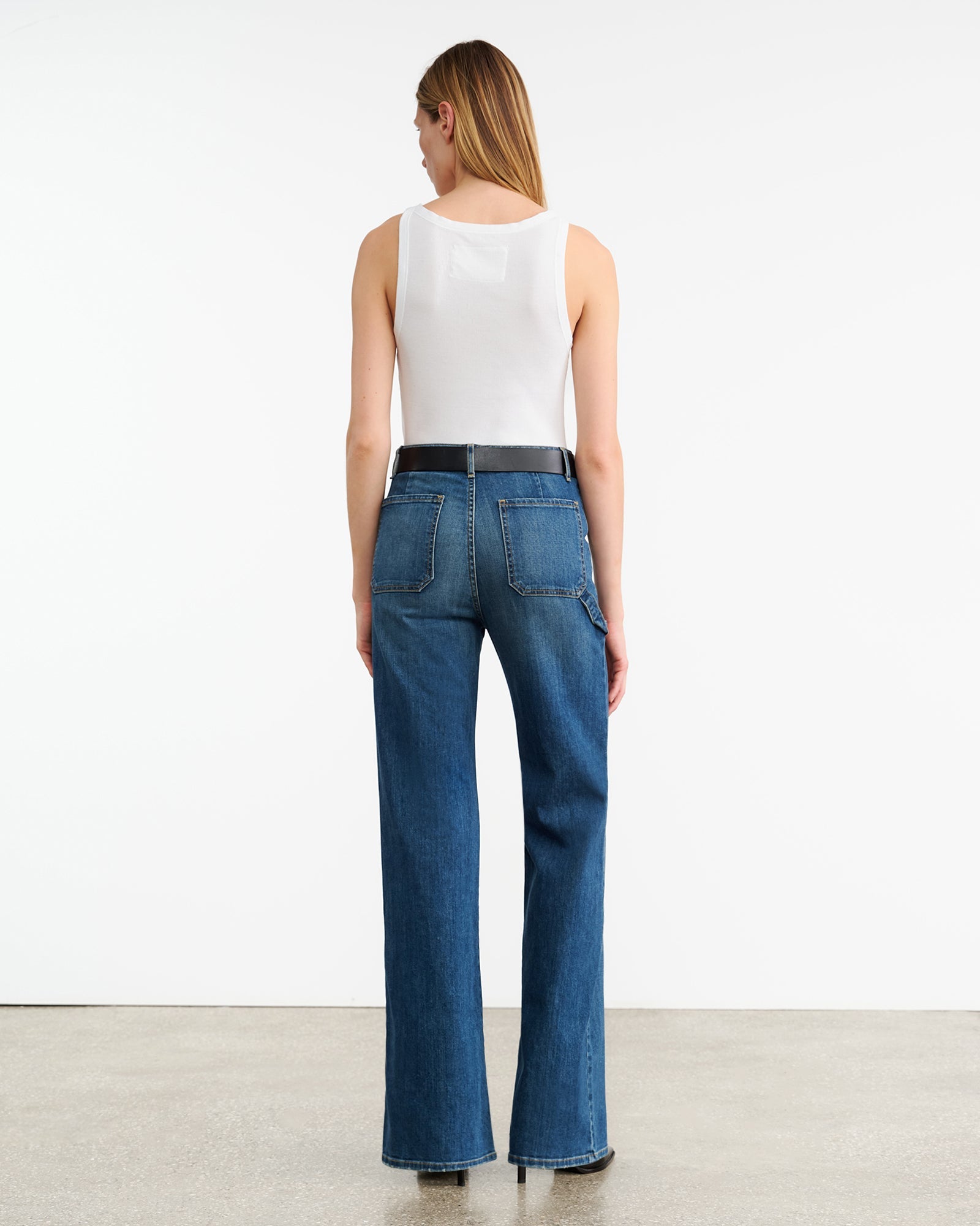 High-rise straight leg jean in Japanese stretch denim. Fitted through waist and hips. Front patch pockets. Carpenter tabs. Back patch pockets. Hammer loop. Zip fly. Shank closure. Belt loops.