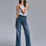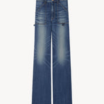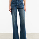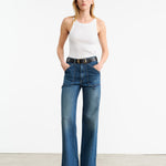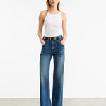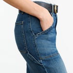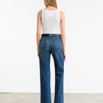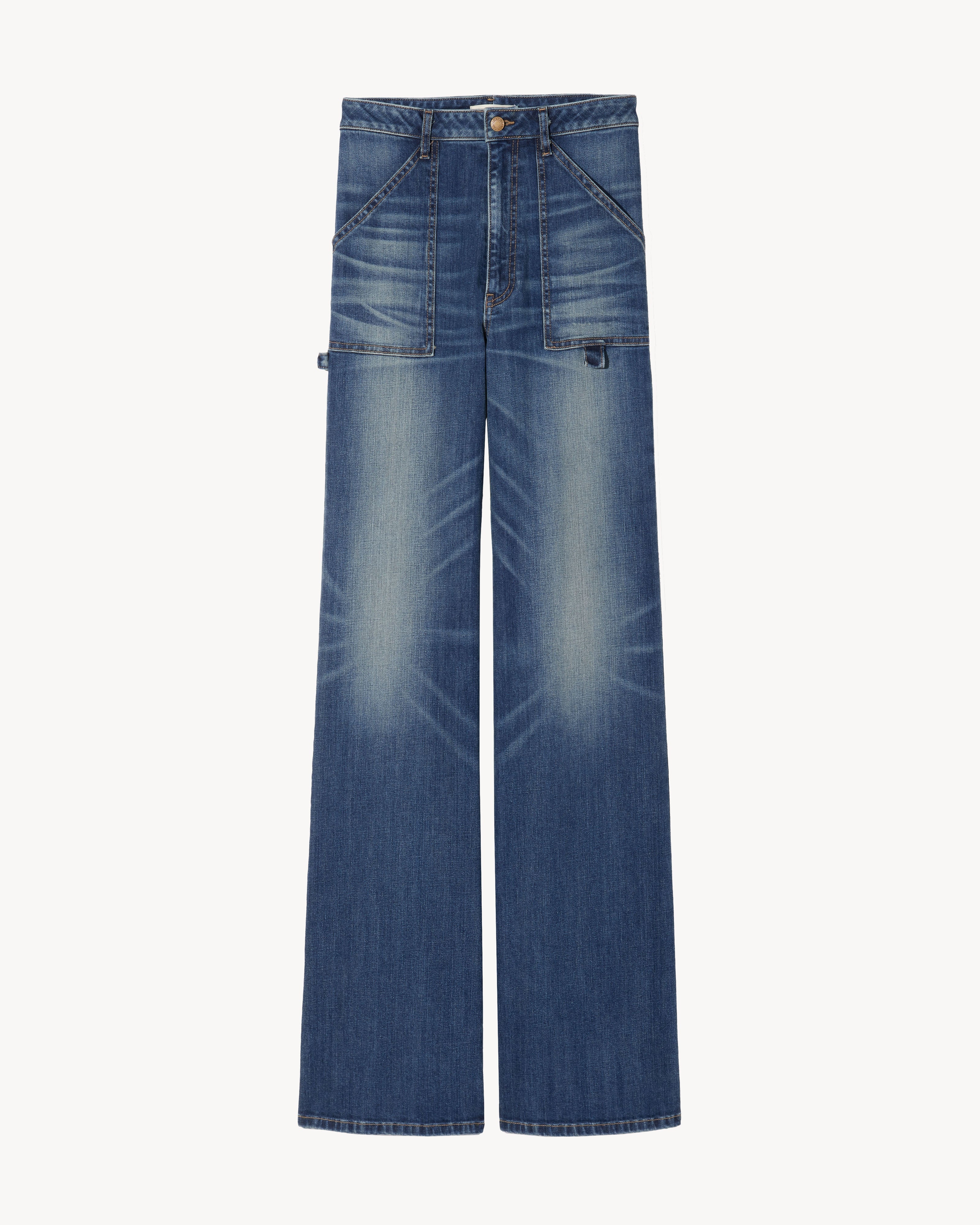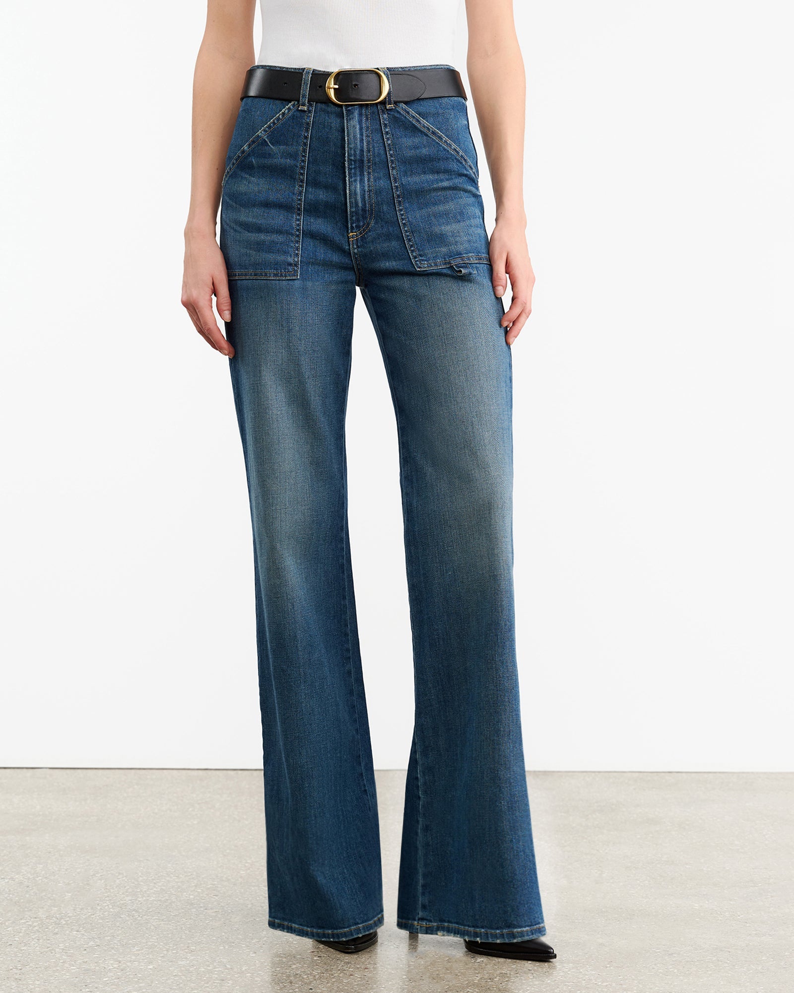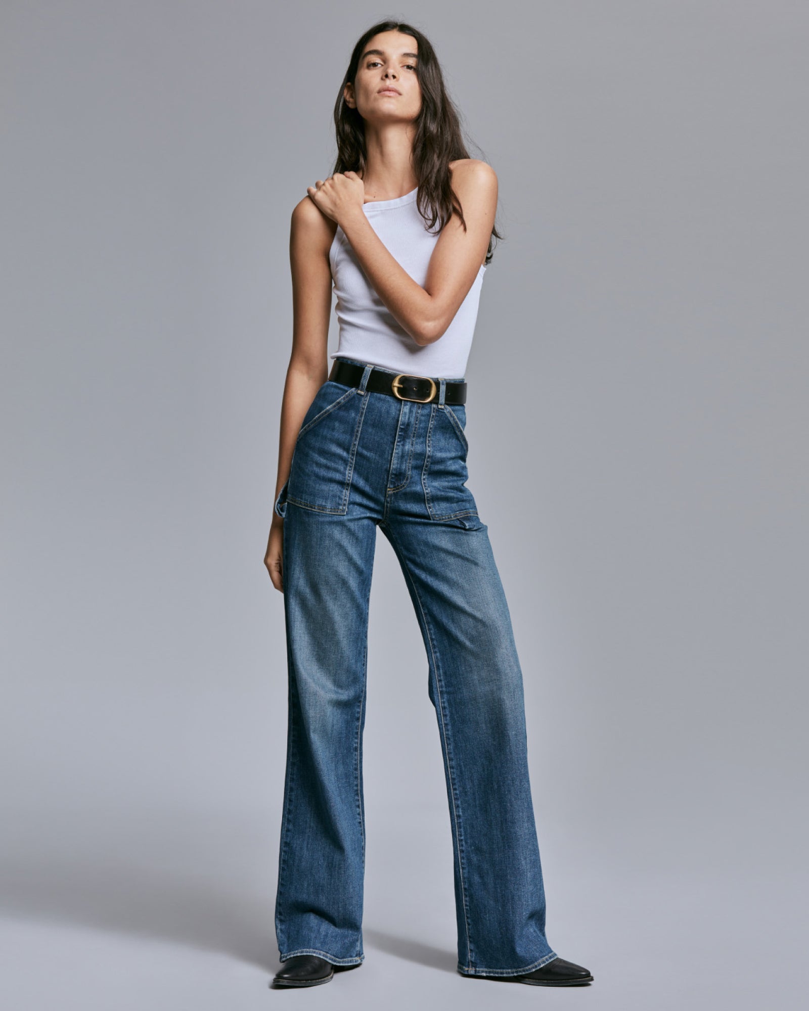 High-rise straight leg jean in Japanese stretch denim. Fitted through waist and hips. Front patch pockets. Carpenter tabs. Back patch pockets. Hammer loop. Zip fly. Shank closure. Belt loops.