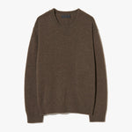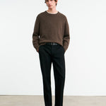 Relaxed fit sweater. Fashioning detail at arm hole and shoulder. Ribbed neck, sleeves, and hem. Signature center back cable knit detail.
