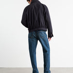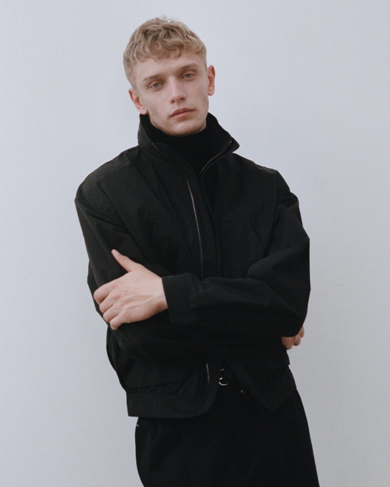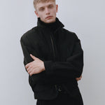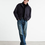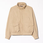 Relaxed bomber jacket. Hidden snap closure. Zip front. Patch pockets. Chest slant pockets. Snaps at cuffs. Cinched waist. Interior chest pocket. Hidden zipper at collar with hood. Not constructed. Fully lined.