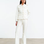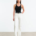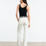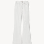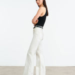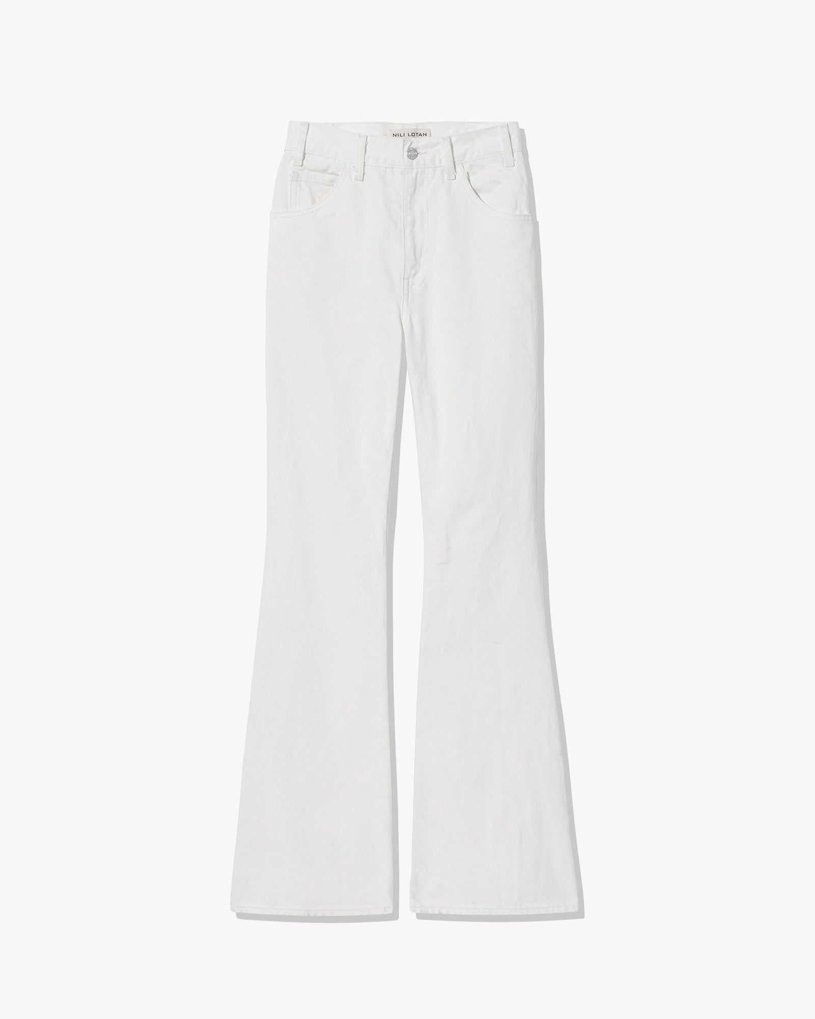 High-rise flare leg jean in Japanese non-stretch heavyweight crosshatch denim. Fitted through waist and hips. Opens to a flare leg. Zip fly. Shank closure. Five pocket detail. Belt loops.