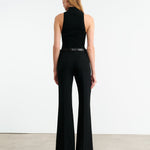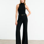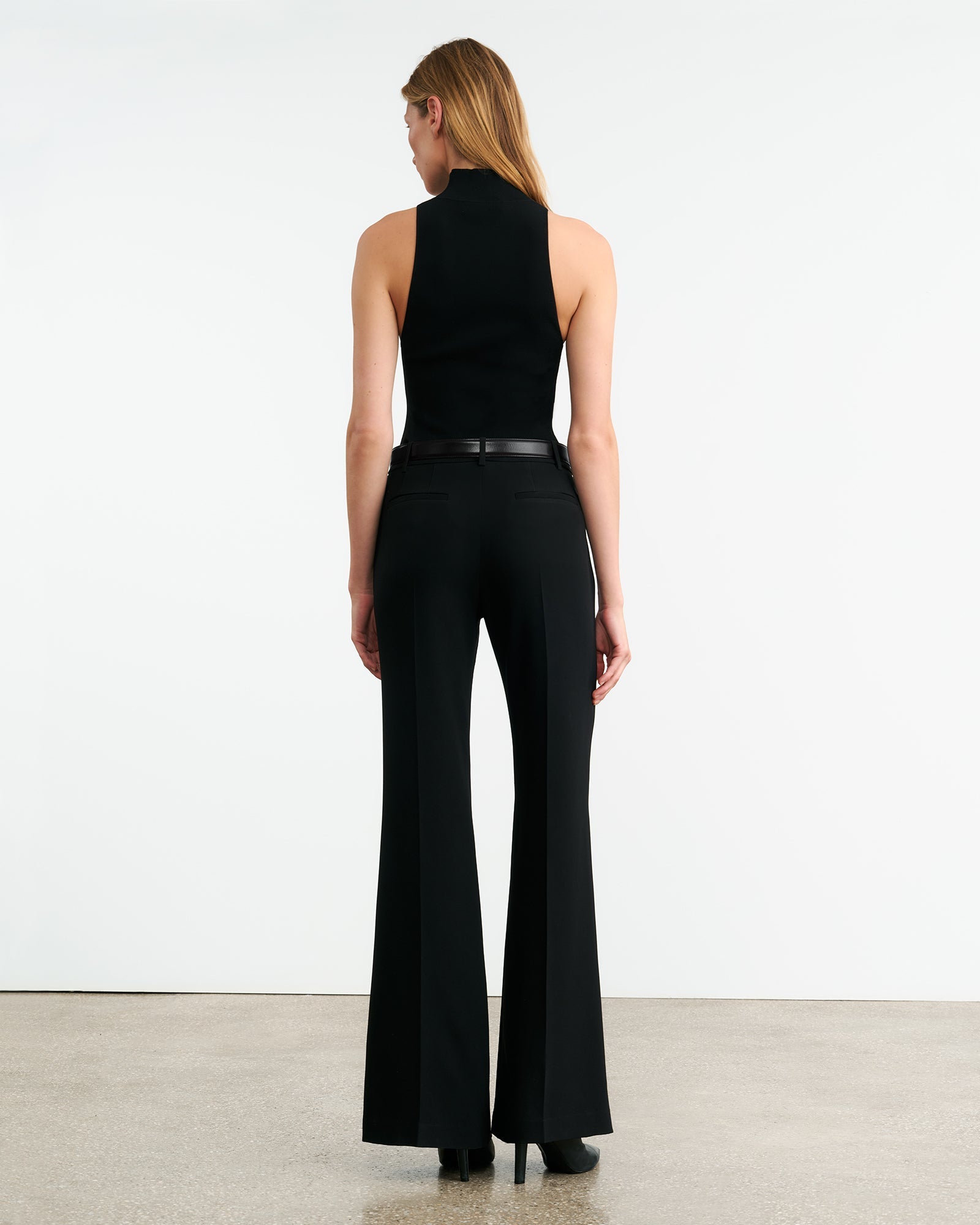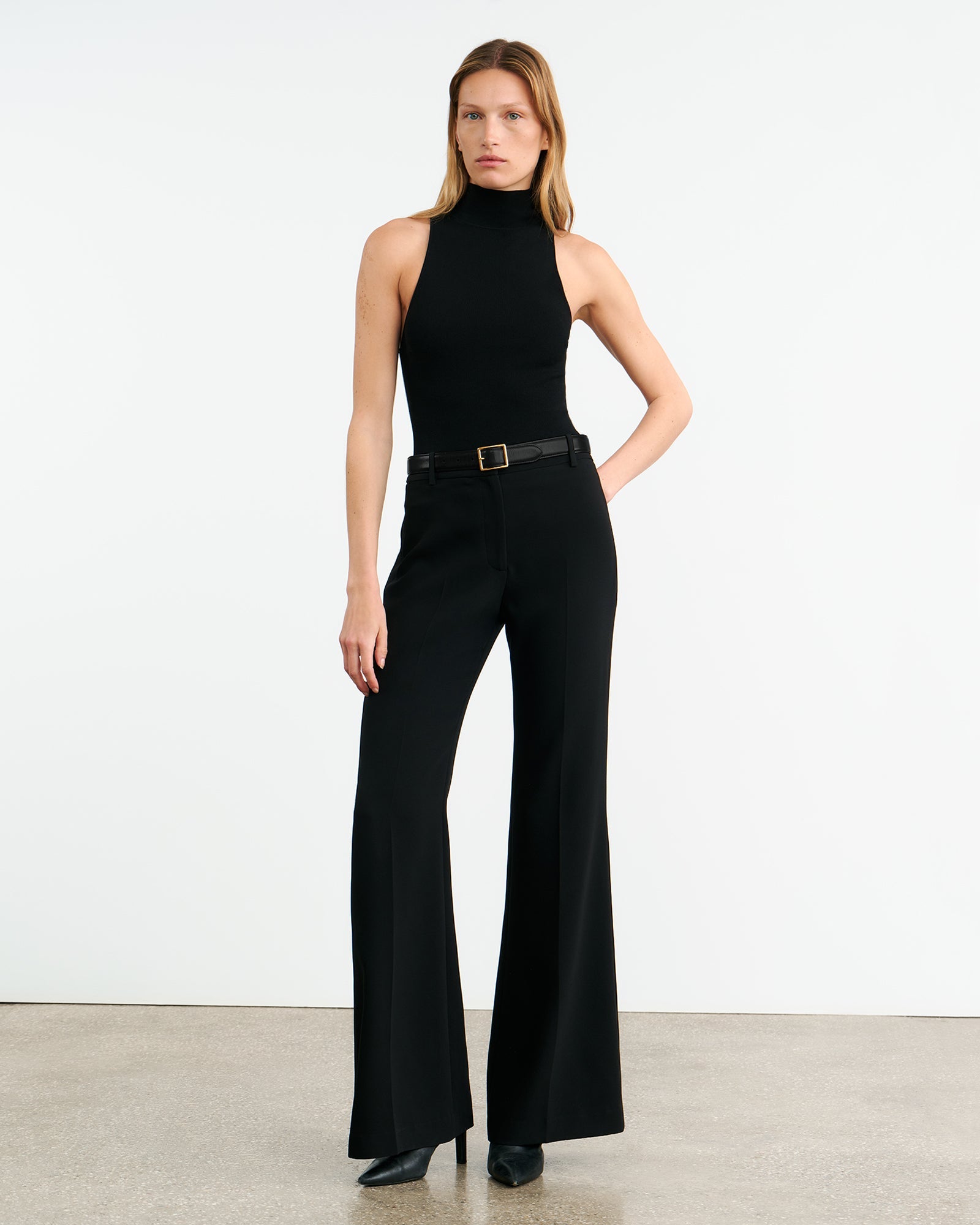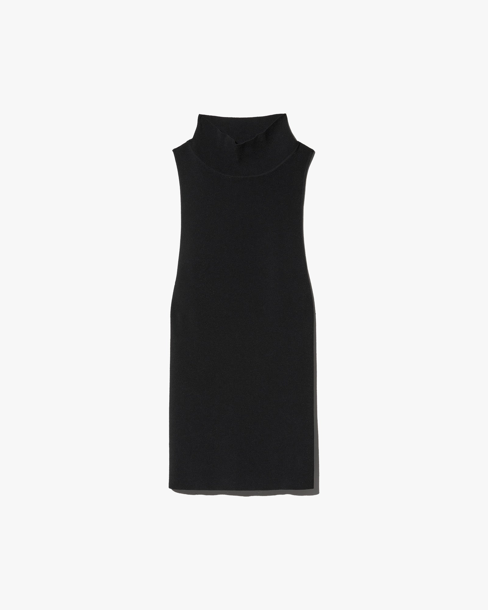 Sleeveless mock neck sweater. Form-fitting silhouette. Low armholes.