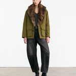 Oversized, relaxed fit parka in piece-dyed fabric. Patch pockets with pleated detail. Dropped shoulders. Horn button front closure. Removable Toscana shearling collar and lapel to match. Straight hem. Fully lined.