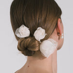 Like a bouquet of roses for the hair, the Rosalia Hairpins are crafted with three-dimensional realism, mimicking the real thing when tucked into a bun or French twist. A set of three, each flower is made by hand in New York, hand-formed with silk chiffon, and finished with a luxurious 18-karat gold-plated hairpin. Dial up the drama and layer multiple sets at once. Dimensions: Small Rose: 1 5/8in x 1 1/4in + 2 7/8in pin Large Rose: 2in x 1 1/2in + 2 7/8in pin