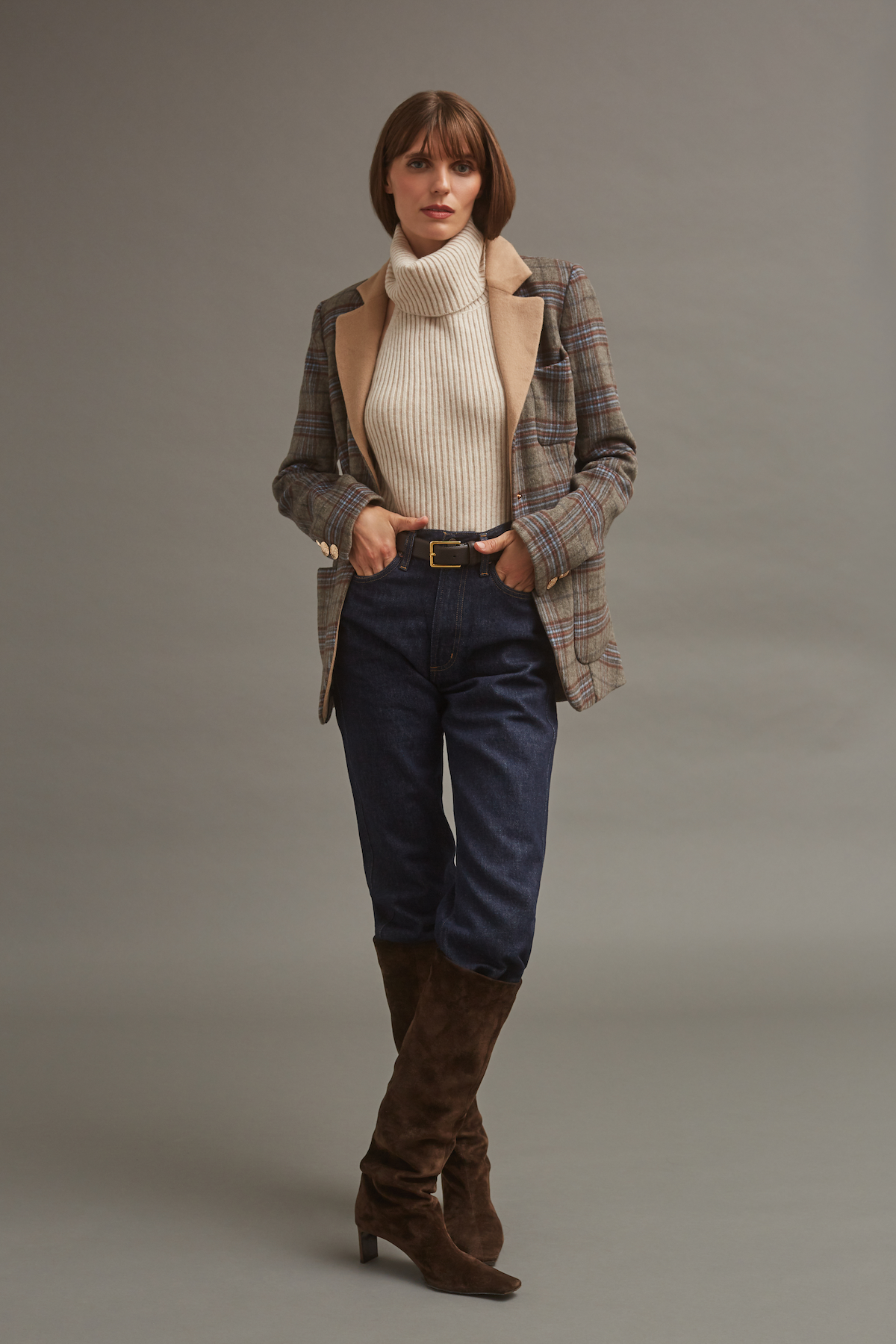 The Ross Blazer is a lesson in menswear-inspired style. The double-faced plaid wool delivers luxury with plenty of warmth. The contrasted camel collar and lapel with self patch pockets heighten the interest, while novelty gold snap buttons add an element of equestrian cool.