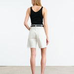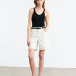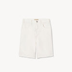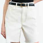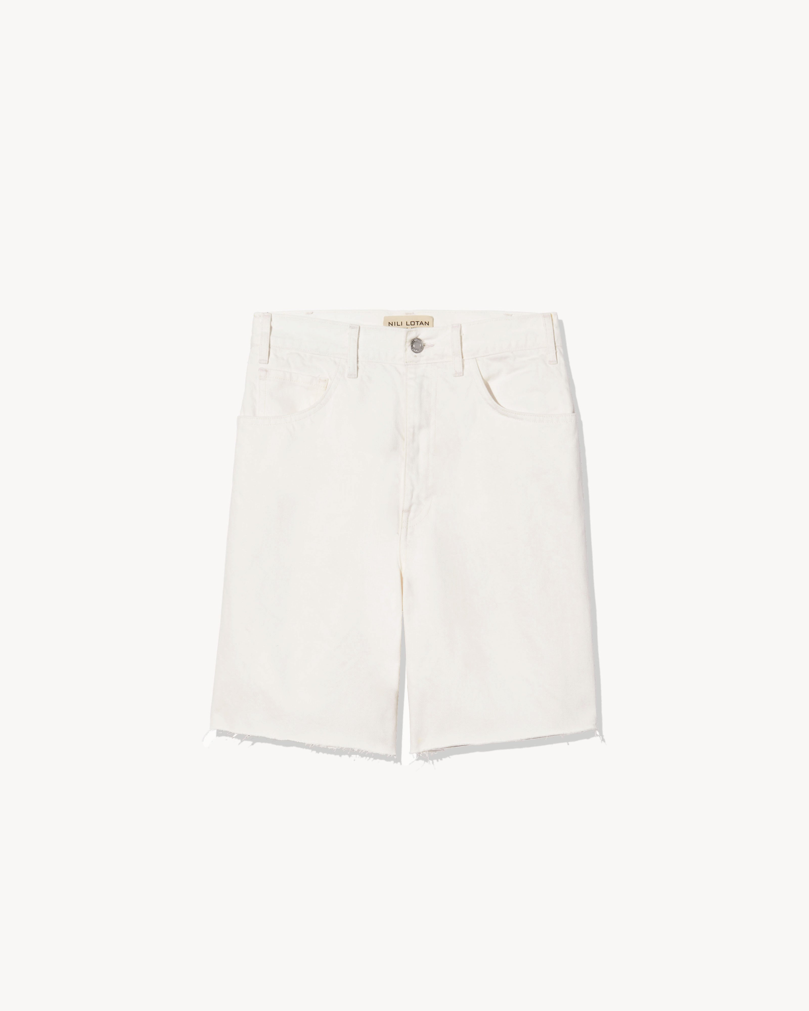 Low-rise relaxed leg jean short in Japanese non-stretch denim. Five pocket detail. Fly zip. Shank closure. Longer inseam. Raw hem. Natural fray. Belt loops.