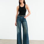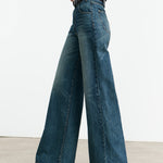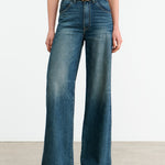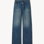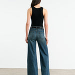 High-waist jean in Japanese non-stretch denim. Five pocket detail. Straight wide leg. Zip fly. Shank closure. Belt loops at waistband.