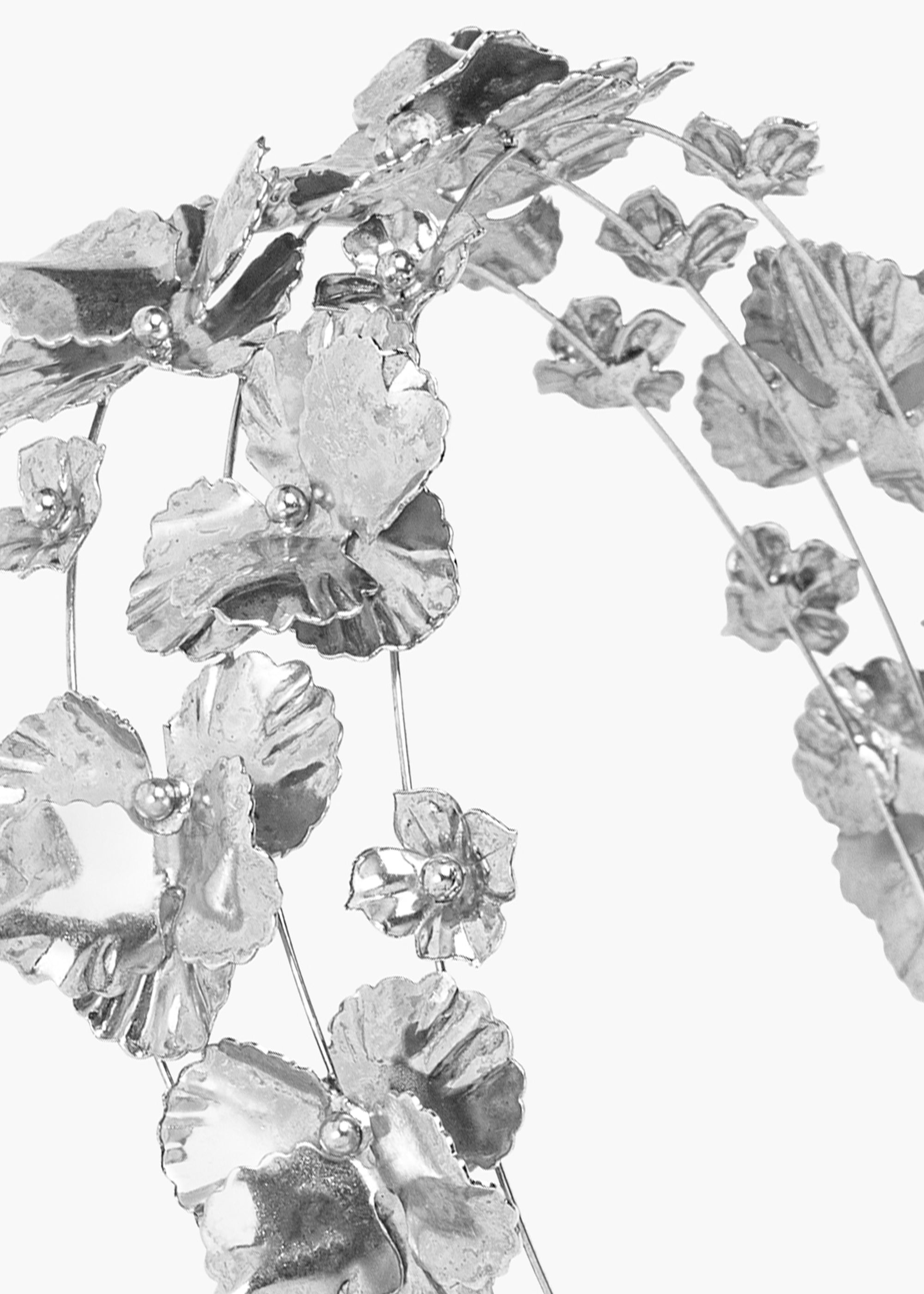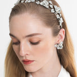 The Sariyah Headband forms a halo with three rows of sculptural flowers. The flexible headband base disappears into the hair, so that these blooming florals appear to be floating in the hair. For even more glow, pair this style with the coordinating Pansy Earrings.
