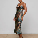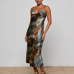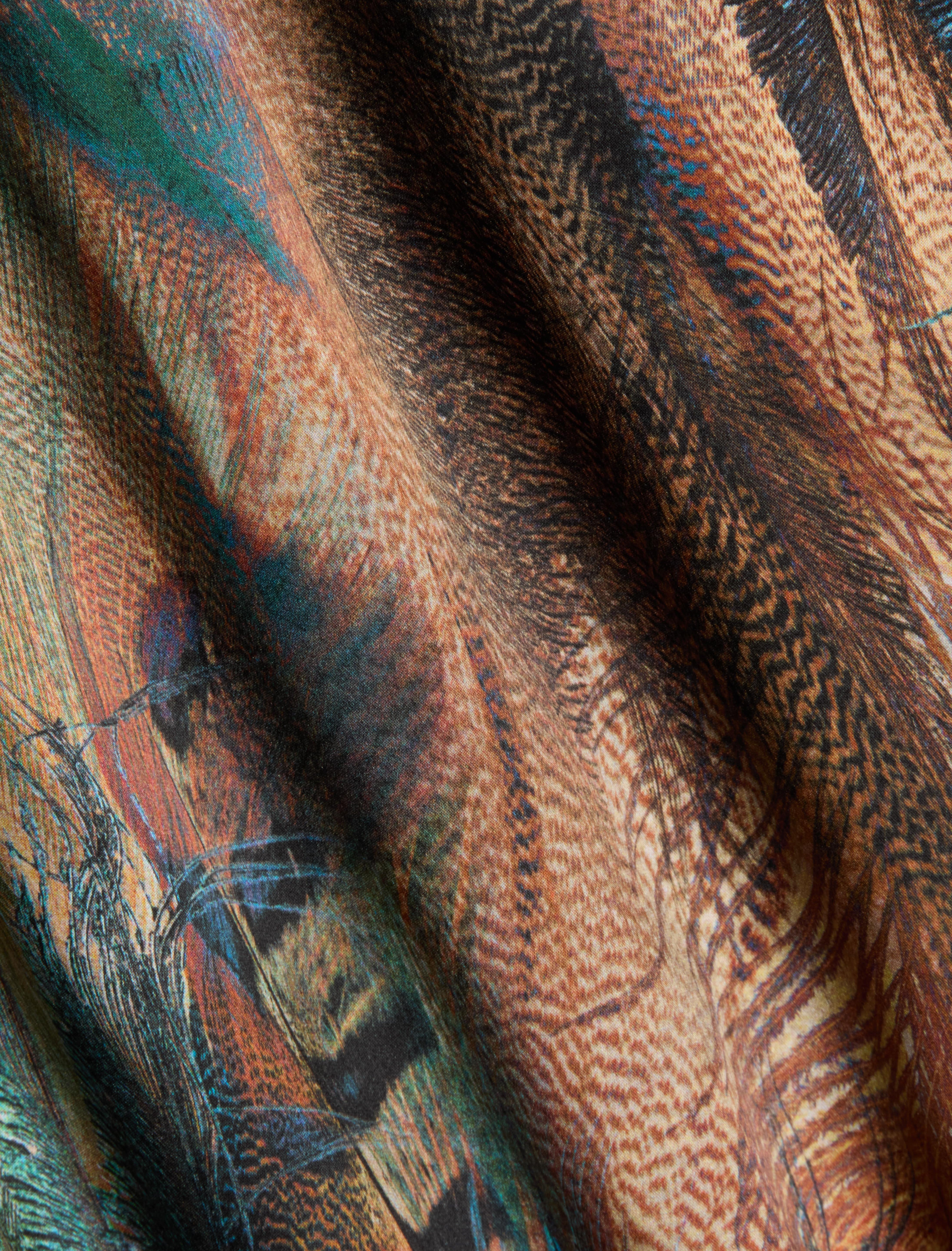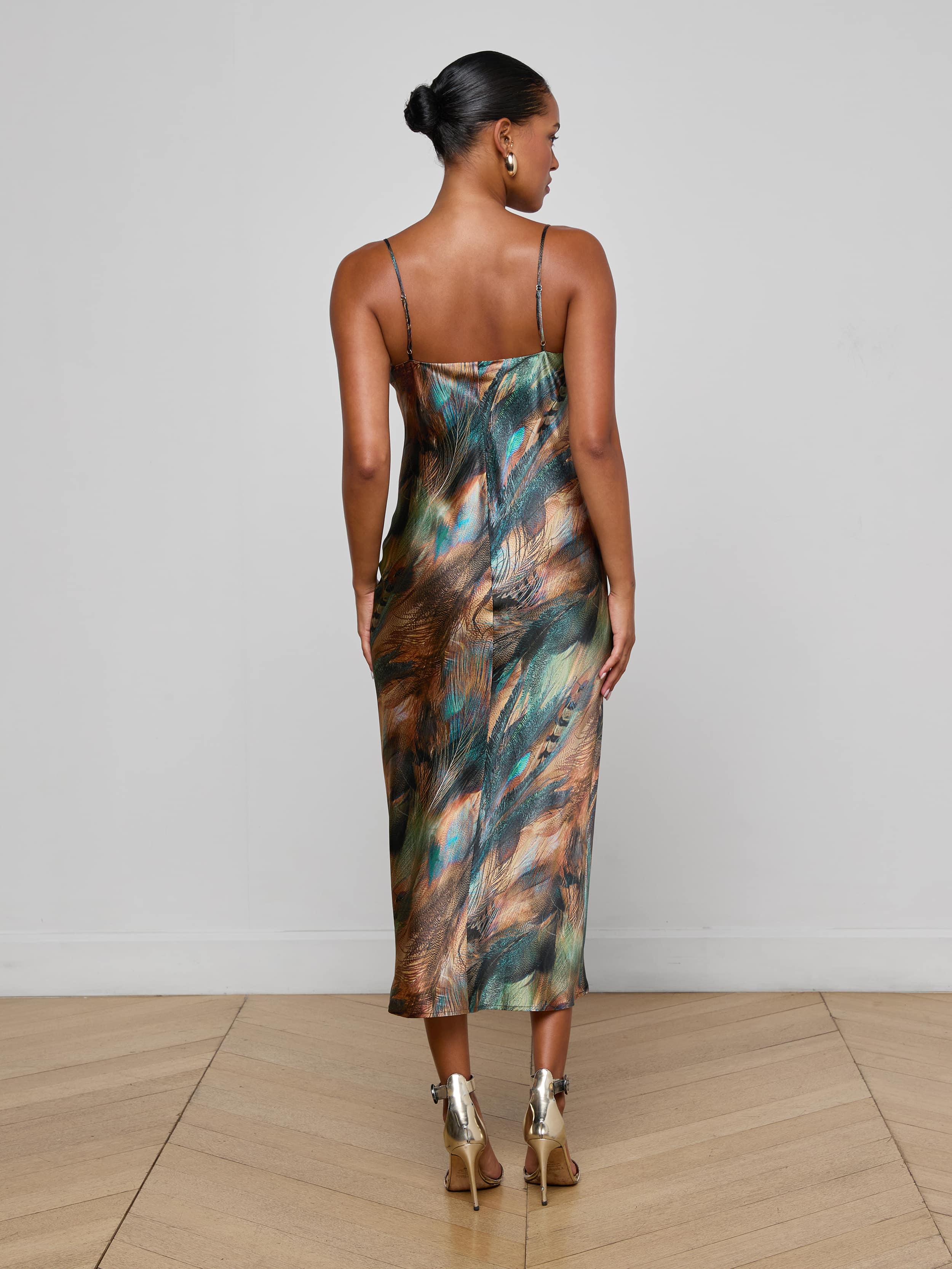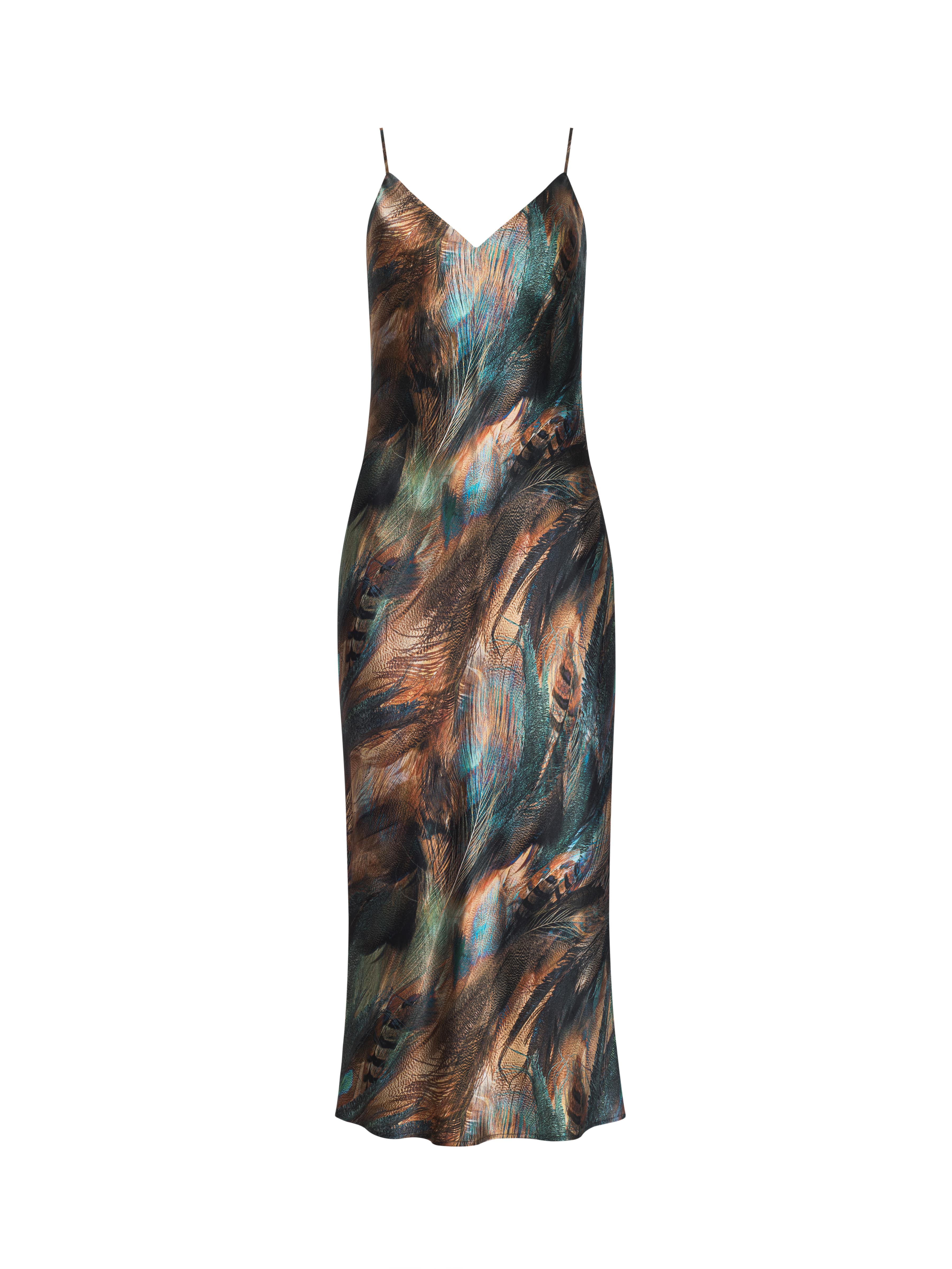 Our iconic silk slip dress is back in a dynamic teal feather print. Designed with a deep V-neck and subtly sexy bias cut, this midi dress is a year-round essential. Pair with a strappy sandal for the perfect special occasion look.