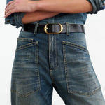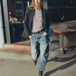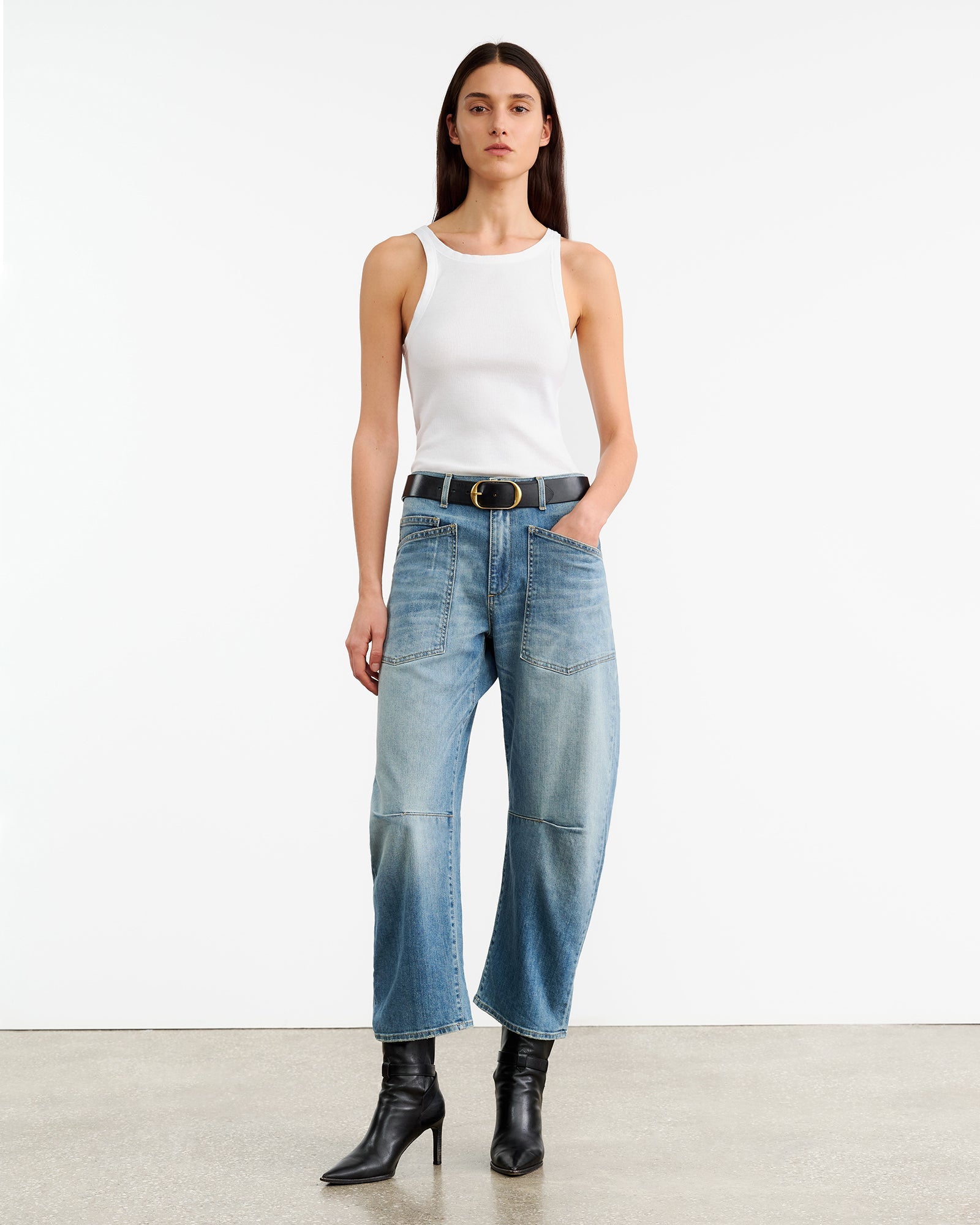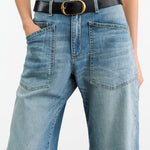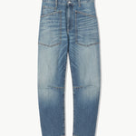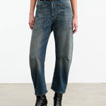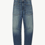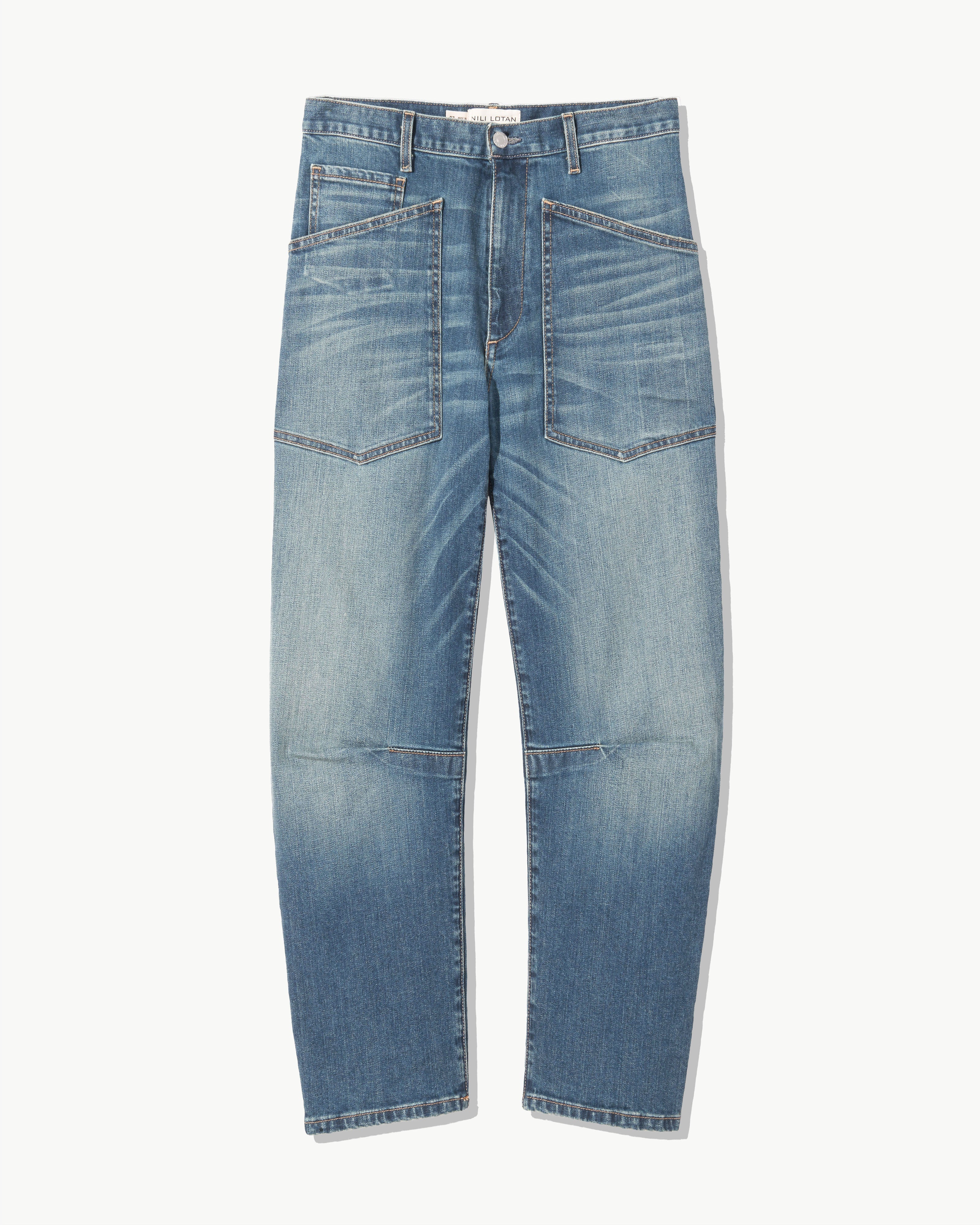 Mid-rise, relaxed fit barrel leg jean in Japanese stretch denim. Uniquely curved silhouette. Seam detail at knees. Gusset at inseam. Zip fly. Shank closure. Top-stitched front and back patch pockets. Belt loops.