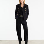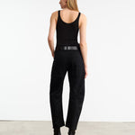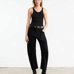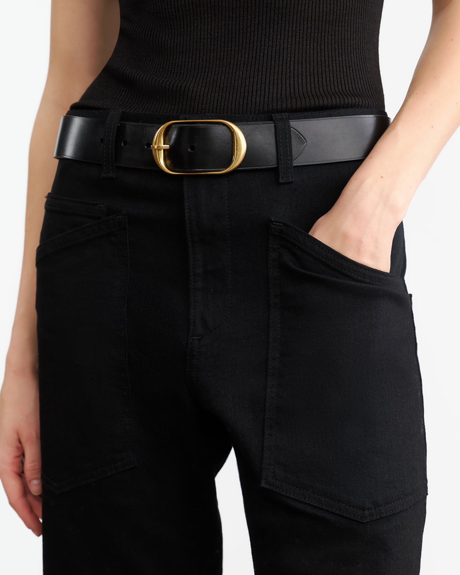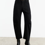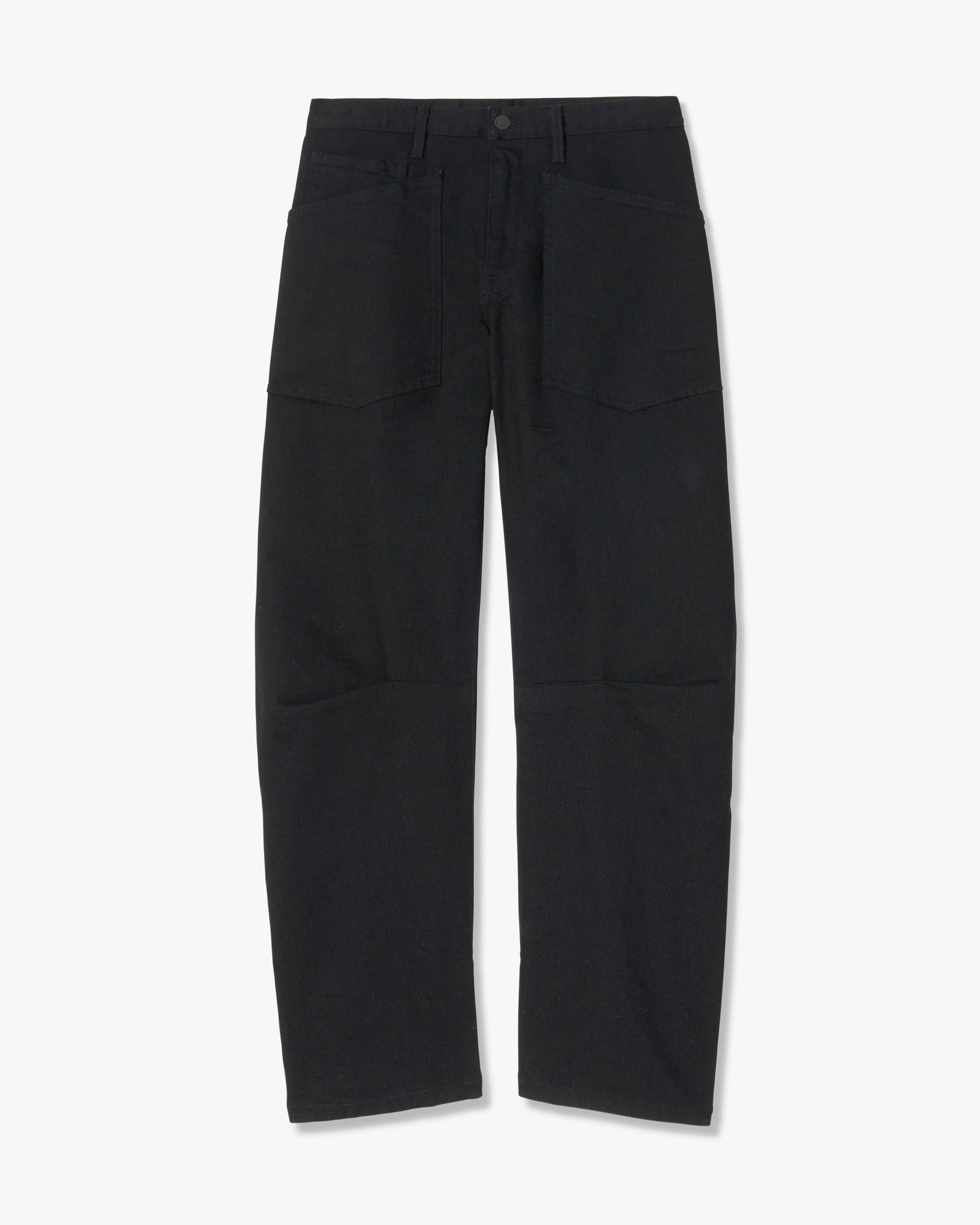 Mid-rise, relaxed fit barrel leg jean in Japanese stretch denim. Uniquely curved silhouette. Seam detail at knees. Gusset at inseam. Zip fly. Shank closure. Top-stitched front and back patch pockets. Belt loops.