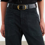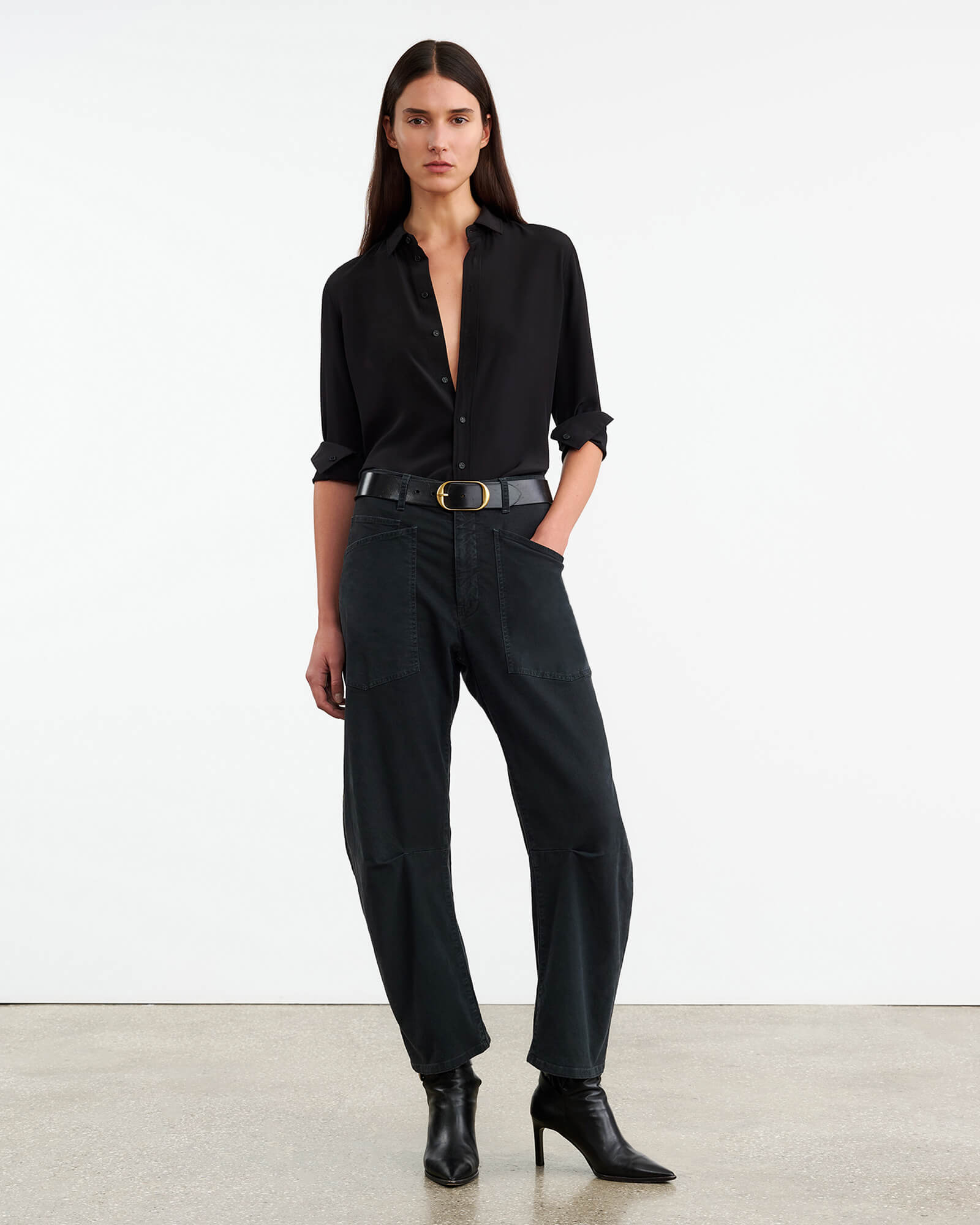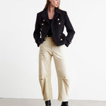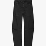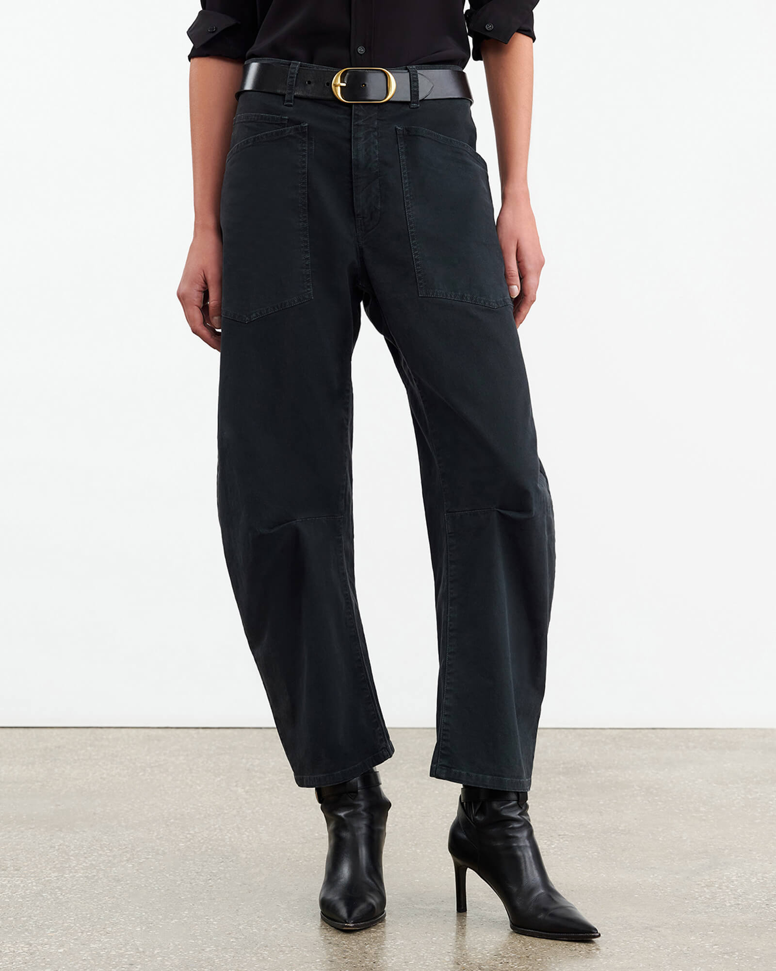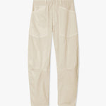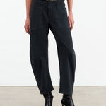 Mid-rise, relaxed fit barrel leg pant. Uniquely curved silhouette. Seam detail at knees. Gusset at inseam. Zip fly. Hidden hook-and-bar closure. Hidden stay button closure. Top-stitched front and back patch pockets. Belt loops.