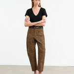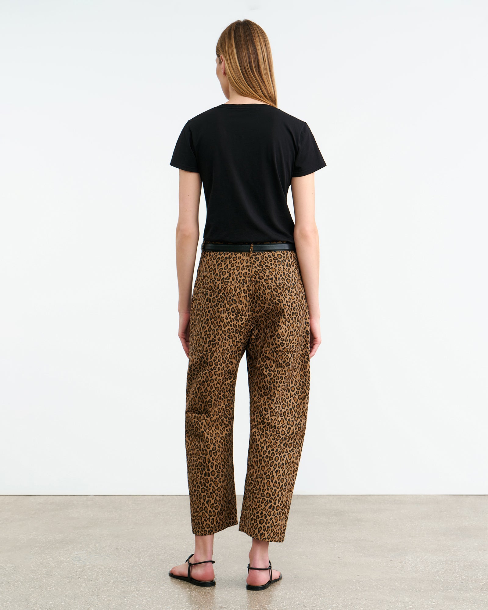 Mid-rise, relaxed fit barrel leg pant in cotton. Uniquely curved silhouette. Seam detail at knees. Gusset at inseam. Zip fly. Hidden hook-and-bar closure. Hidden stay button closure. Top-stitched front and back patch pockets. Belt loops.