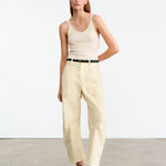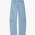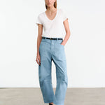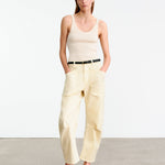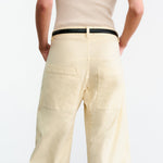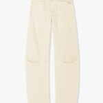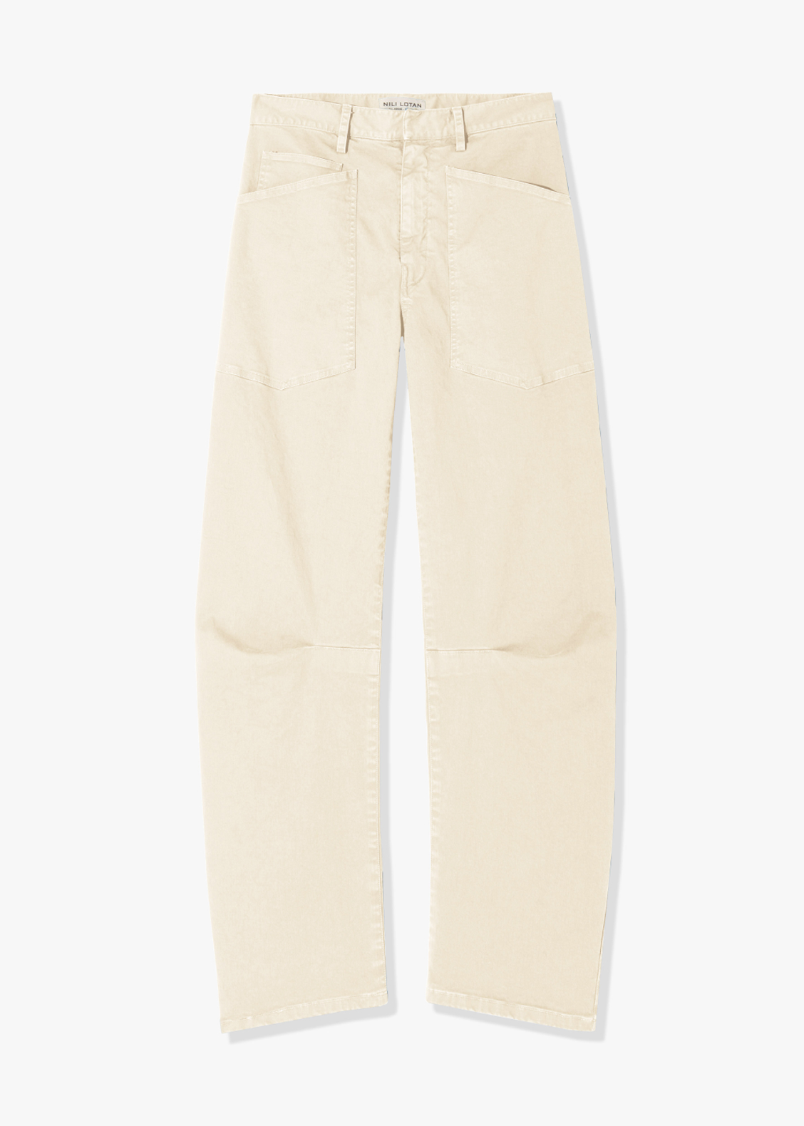 Mid-rise, relaxed fit barrel leg pant in brushed stretch twill cotton. Uniquely curved silhouette. Seam detail at knees. Gusset at inseam. Zip fly. Hidden hook-and-bar closure. Hidden stay button closure. Top-stitched front and back patch pockets. Belt loops.