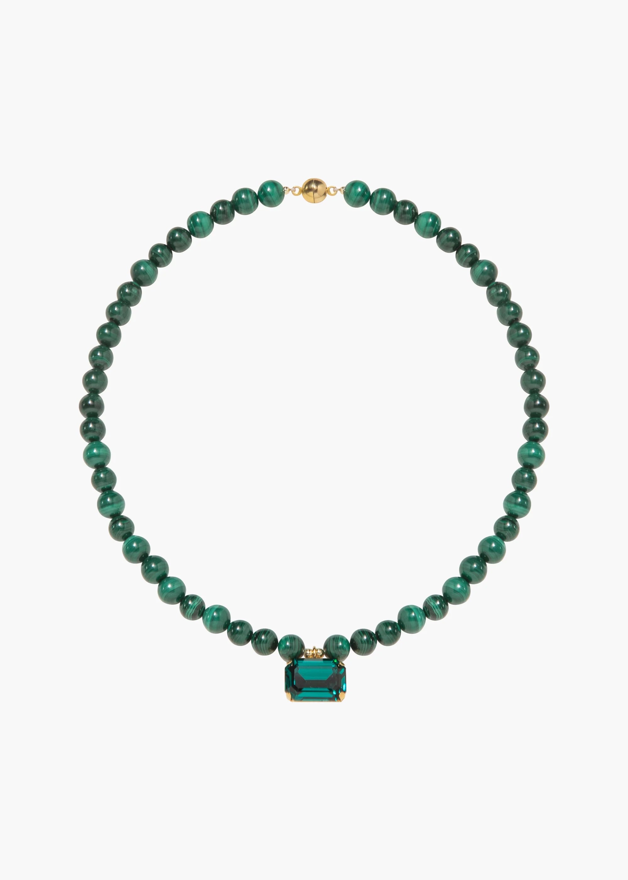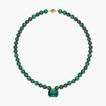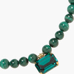 The Sidonie Necklace features natural semi-precious malachite beads, with an emerald-cut Austrian crystal pendant, chosen to complement the stones' natural hue. With its distinctive natural veining that makes each piece unique, malachite is known as the "stone of transformation," used for deep energy cleansing. It's finished with an 18-karat gold-plated magnetic clasp, making it particularly easy to wear, whether worn solo or layered in a stack. Dimensions: 17 1/2in x 3/8in (3/4in x 1/2in pendant)
