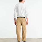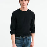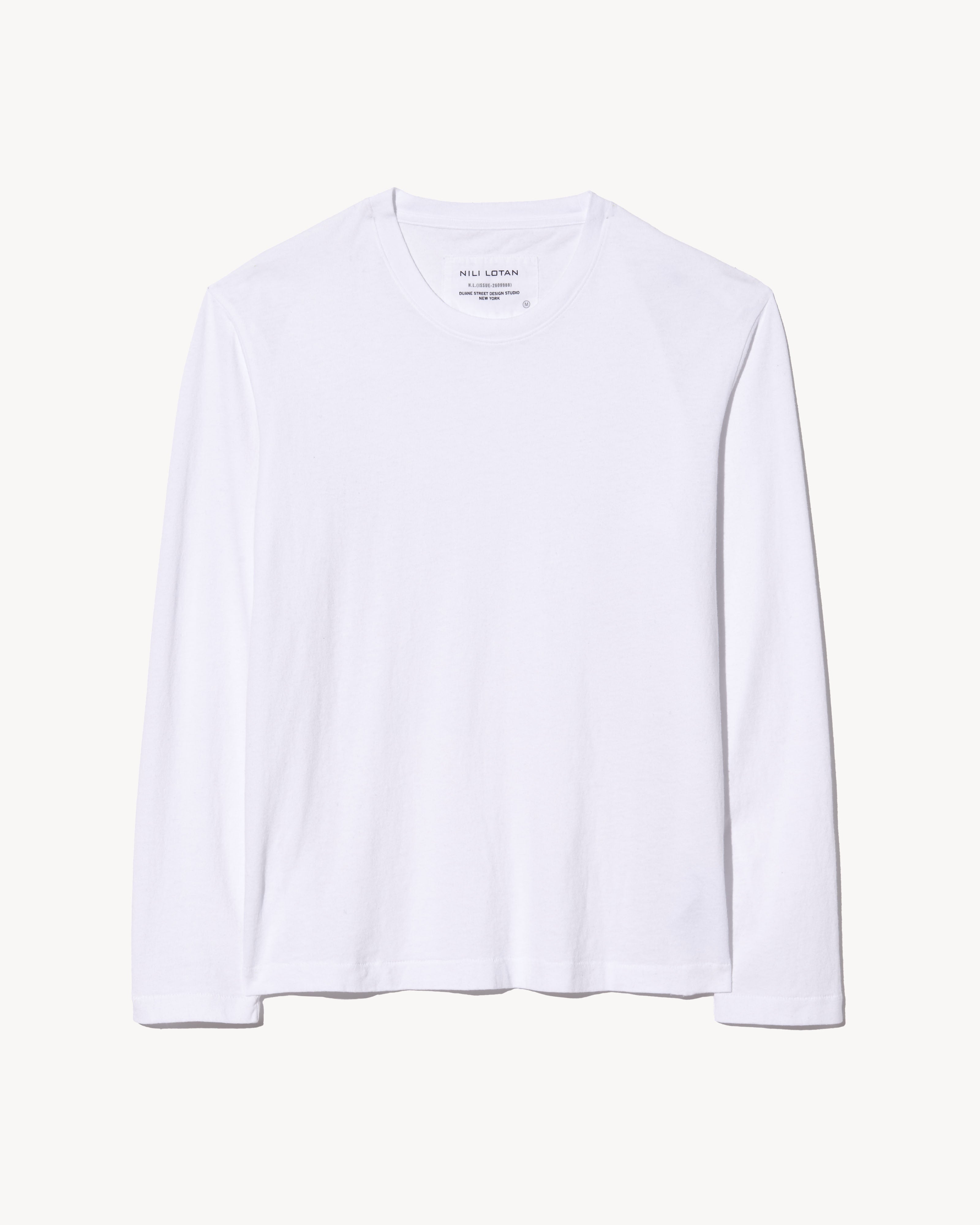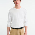 Relaxed fit long sleeve crew neck tee. Standard collar. Vintage pitch sleeve.