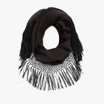 Square scarf in crepe de chine. Custom flat ribbon crochet lacing fringe detail at four sides. Custom fringe artwork. Made in India.