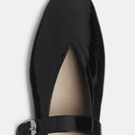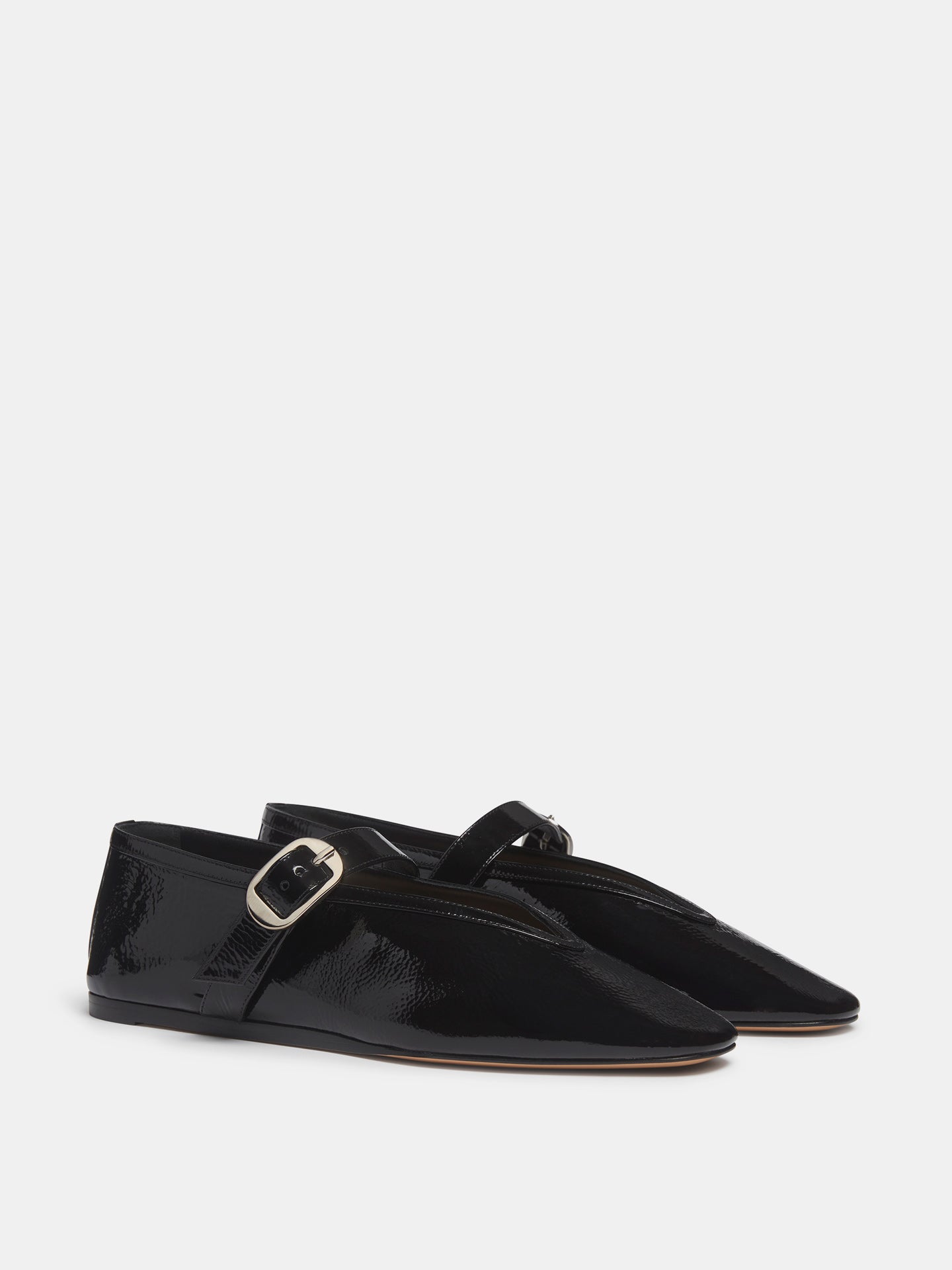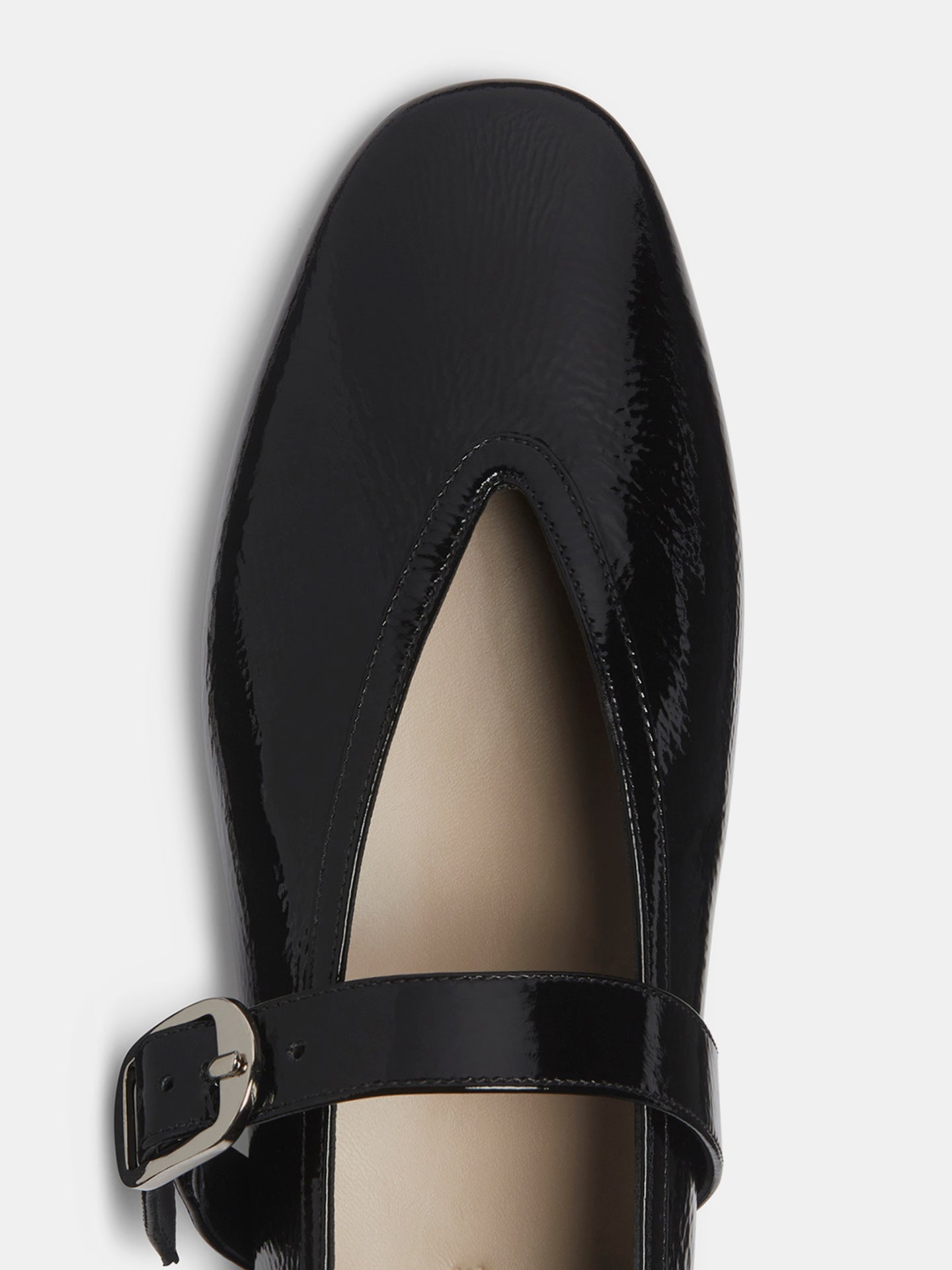 Stella Slipper in black patent leather with buckle-fastening, a cushioned calf leather insole and leather piping. 8mm heel. Made in Italy.